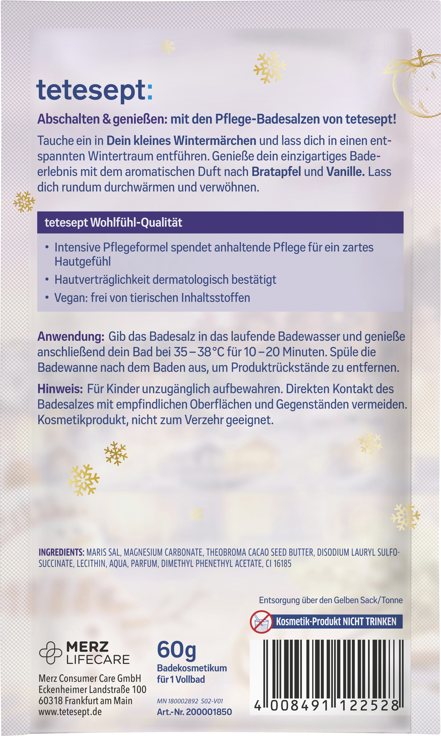 Tauche mit tetesept ein in Dein kleines Wintermärchen und lass dich in einen entspannten Wintertraum entführen. Genieße dein einzigartiges Badeerlebnis mit dem aromatischen Duft nach Bratapfel und Vanille. Lass dich rundum durchwärmen und verwöhnen.