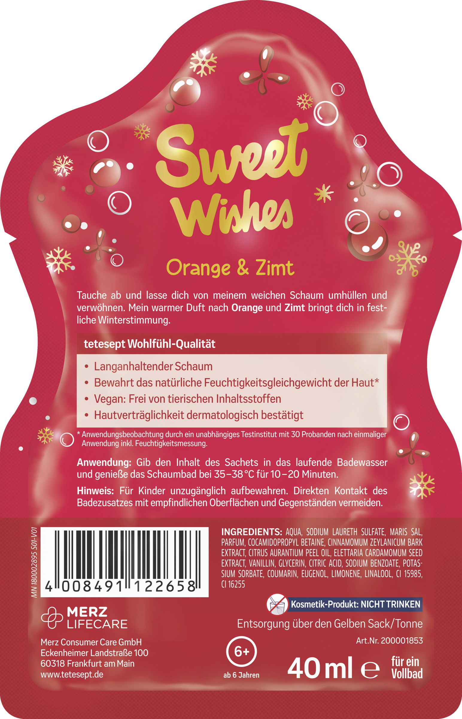 Tauche ab und lasse dich von meinem weichen Schaum umhüllen und verwöhnen. Das pflegende Schaumbad tetesept Badespaß Sweet Wishes mit dem warmen Duft nach Orange und Zimt bringt dich in festliche Winterstimmung.