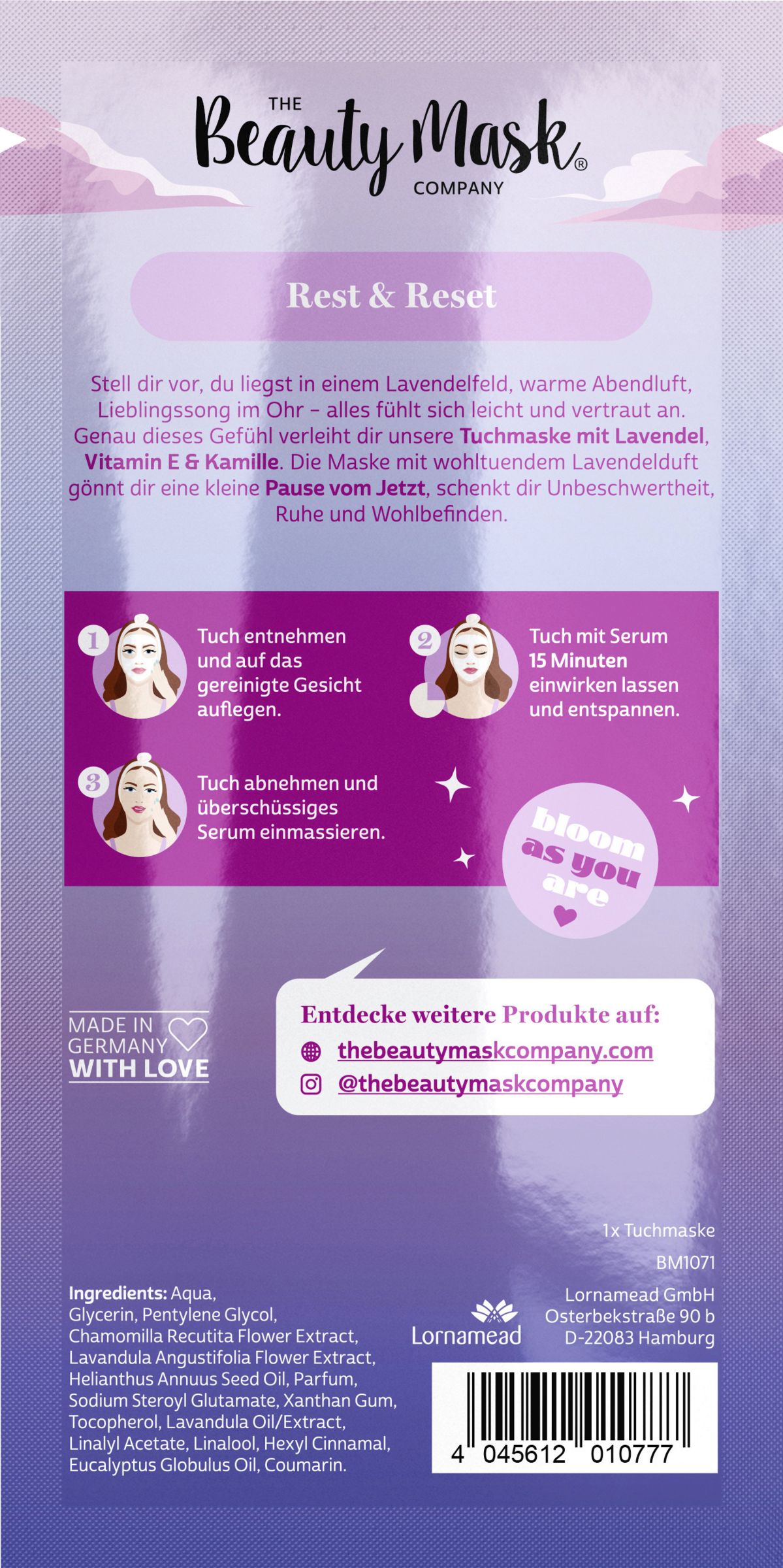 Die Formulierung enthält hochwertige Inhaltsstoffe wie Vitamin E und Kamille, die deine Haut sanft pflegen und dir Ruhe, Unbeschwertheit und Wohlbefinden schenken.