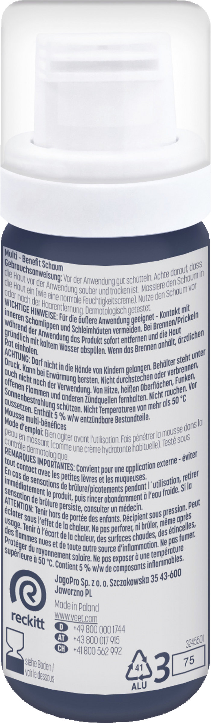 Multi-Benefit Schaum: Aqua, Panthenol, ParaffinumLiquidum, Butane, Steareth-2, Ceteareth-12, Isobutane, Stearyl Alcohol, Propane, Ceteareth-20, Phenoxyethanol, Dimethicone, Allantoin, Glycerin, Distearyl Ether, Ethylhexylglycerin, Citric Acid