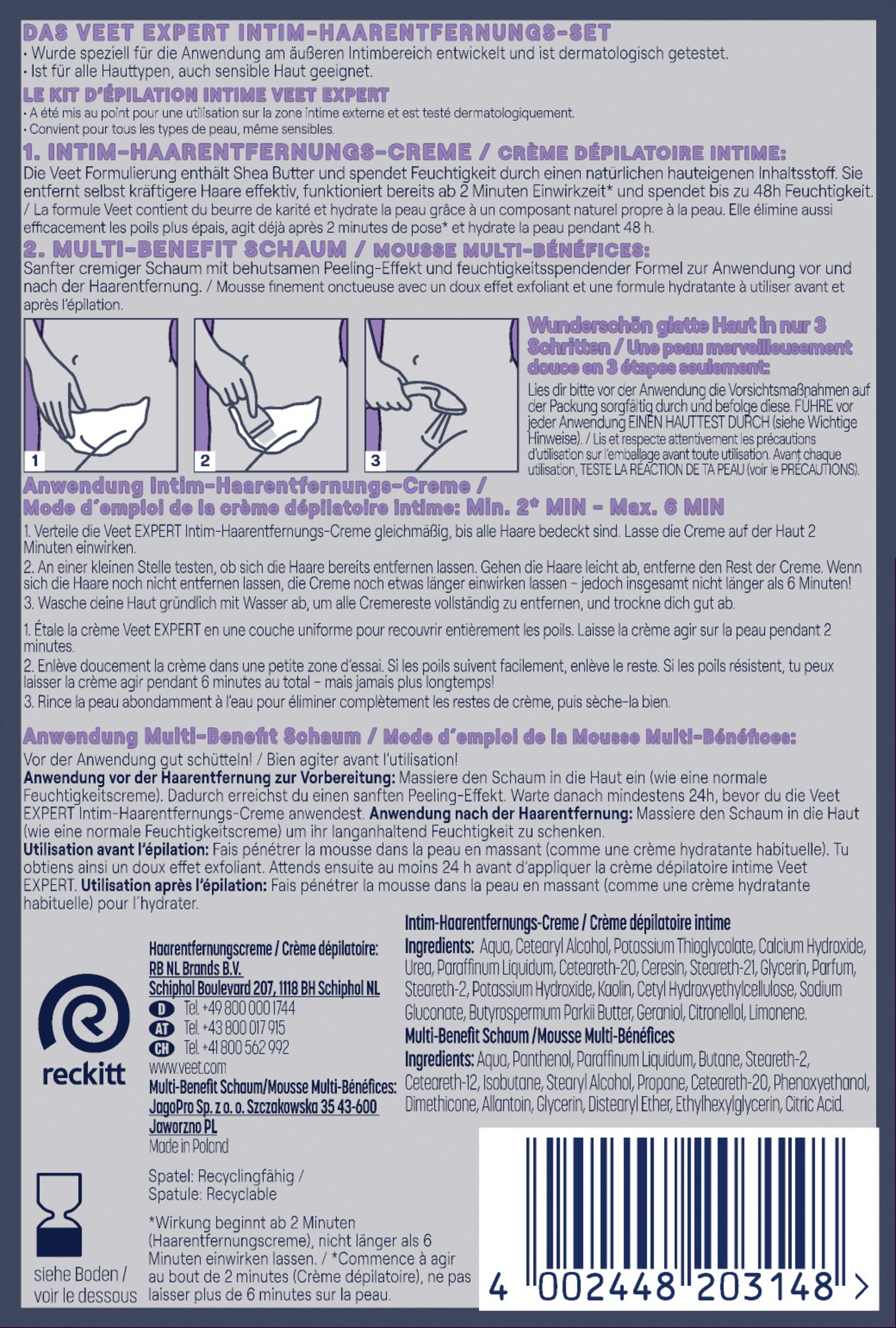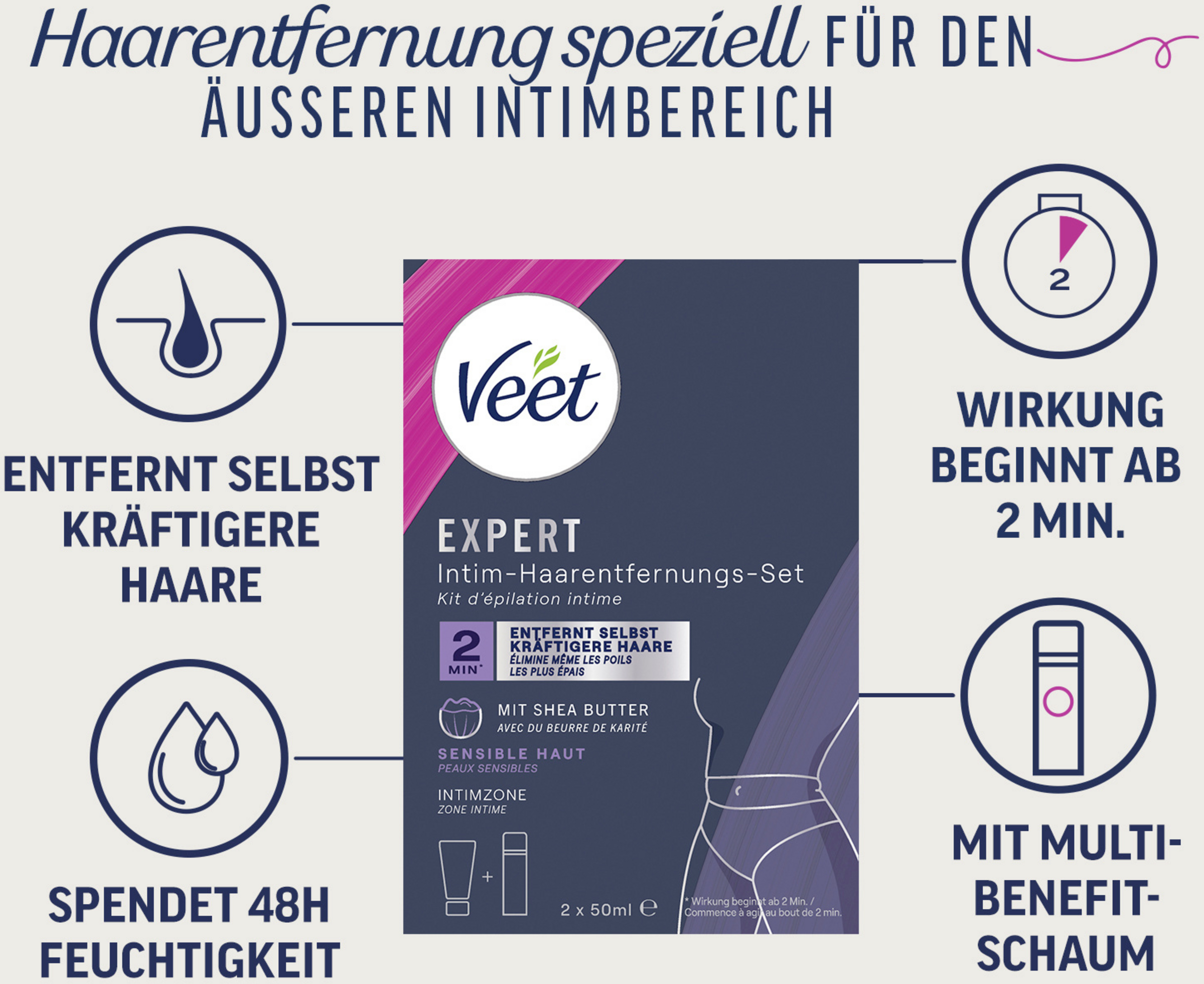 Das Set enthält die Veet Expert Intim-Haarentfernungscreme, die speziell für die sensible Haut im gesamten äußeren Intimbereich entwickelt und dermatologisch getestet wurde sowie den Multi-Benefit-Schaum für die optimale Vor-und Nachbehandlung.
