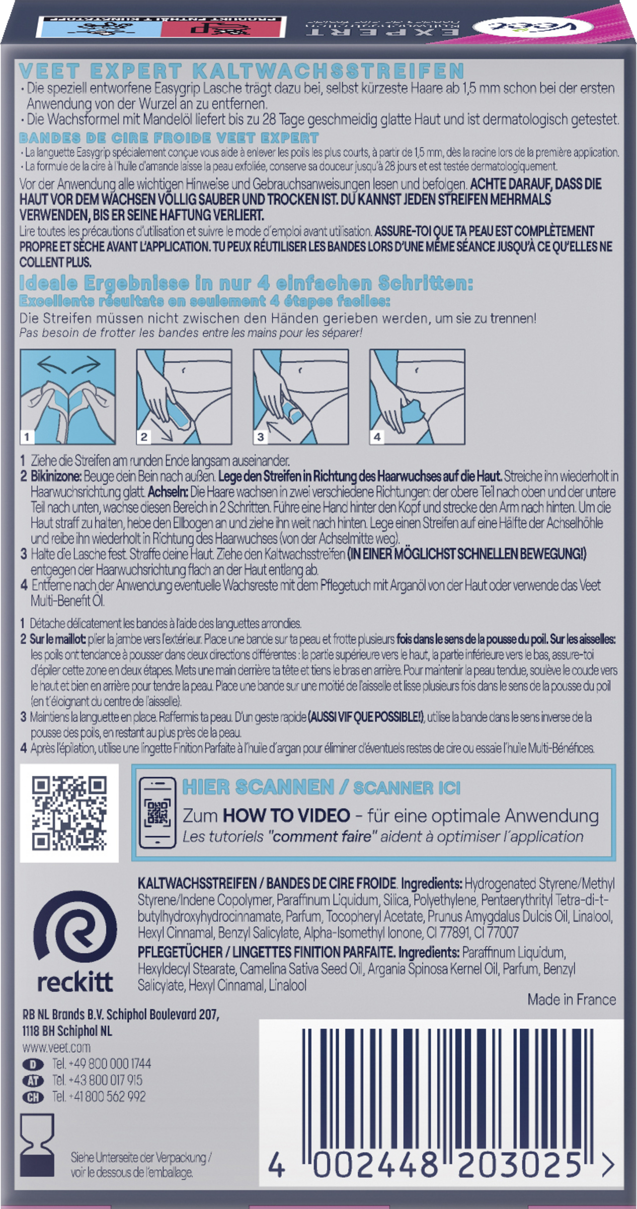 Kaltwachsstreifen: Hydrogenated Styrene/Methyl Styrene/Indene Copolymer, Paraffinum Liquidum, Silica, Polyethylene, Pentaerythrityl Tetra-di-t-butylhydroxyhydrocinnamate, 3237177 Parfum, Tocopheryl Acetate, Prunus Amygdalus Dulcis Oil, Linalool, Hexyl Cinnamal, Benzyl Salicylate, Alpha-Isomethyl Ionone, CI 77891, CI 77007 / Pflegetücher: Paraffinum Liquidum, Hexyldecyl Stearate, Camelina Sativa Seed Oil, Argania Spinosa Kernel Oil, Parfum, Benzyl Salicylate, Hexyl Cinnamal, Linalool