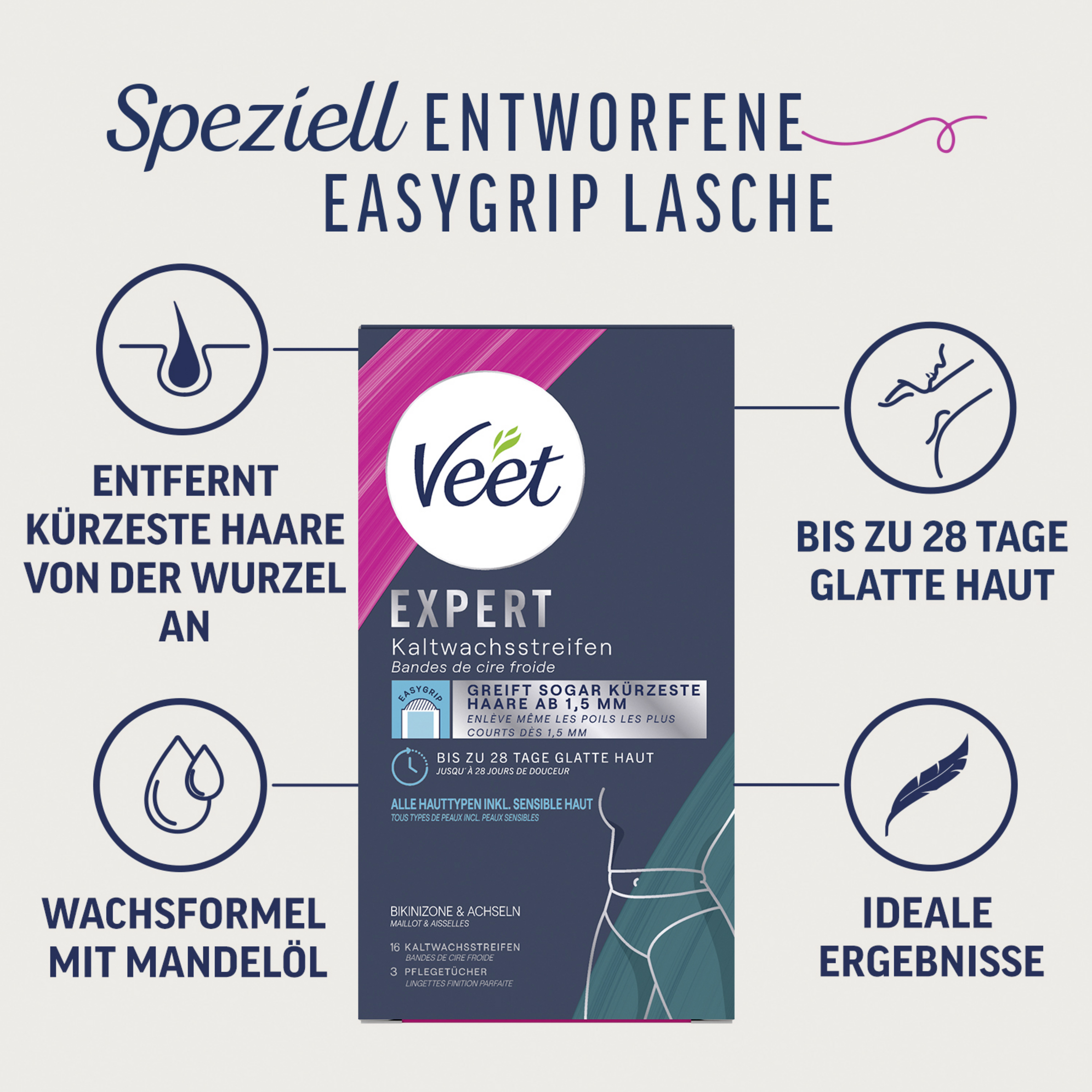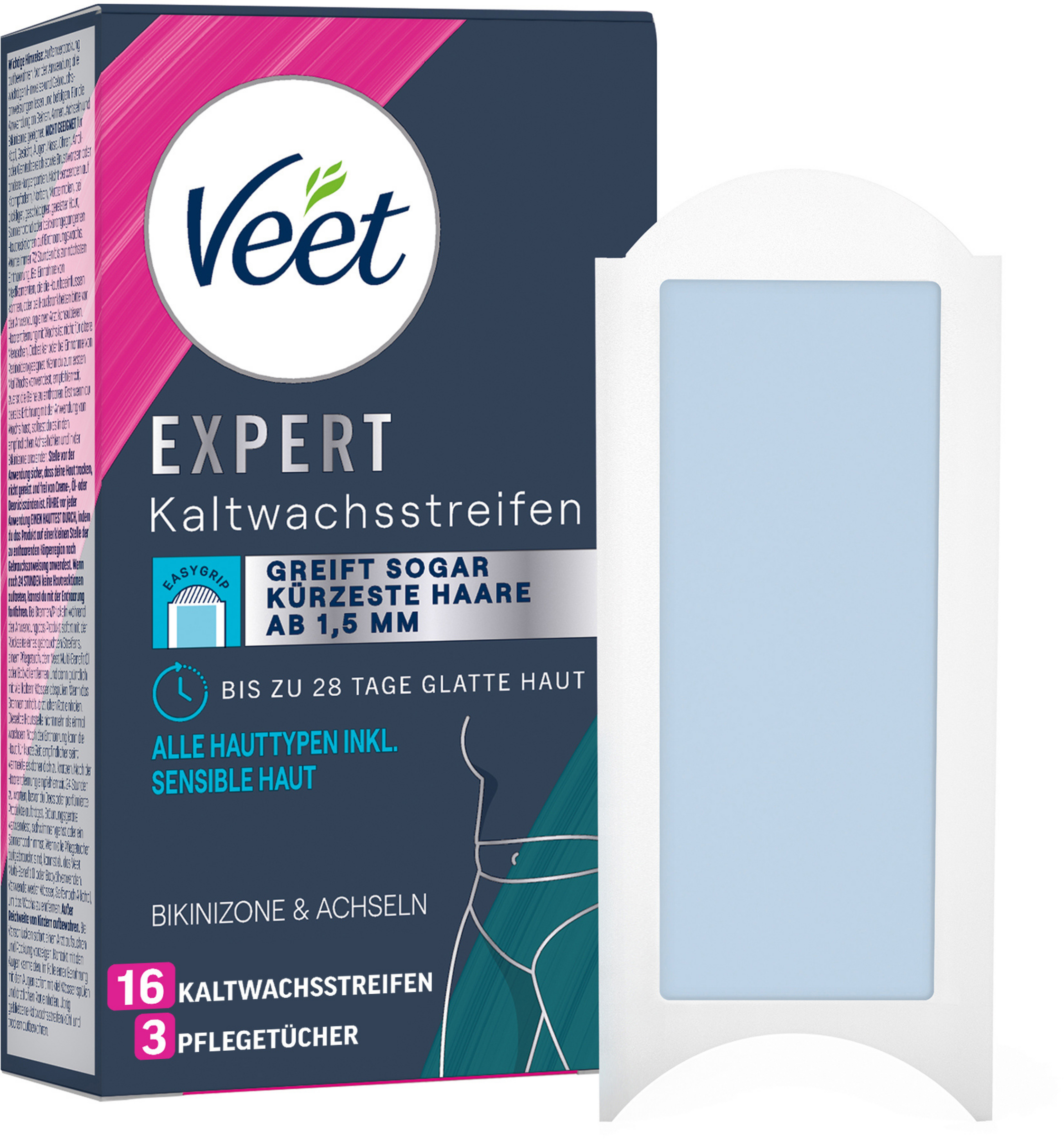 Du wünschst dir glatte Achseln oder eine Bikinizone ohne juckende Stoppelbildung und hast keine Lust auf ständiges Rasieren? Dann sind die Veet Expert Kaltwachsstreifen genau das Richtige für dich. Durch die speziell entworfene Easygrip-Lasche kannst du die Streifen noch einfacher abziehen und selbst kürzeste Haare ab 1,5 mm mühelos von der Wurzel an entfernen. Sie sorgen bis zu 28 Tage für seidig glatte Haut und enthalten wertvolles, pflegendes Mandelöl. Für ein längeres Glättegefühl ohne störende Stoppeln! Die Pflegetücher mit Arganöl entfernen Wachsreste und sorgen für ein strahlendes, gepflegtes Finish. How-To-Videos erleichtern die dir die Anwendung – für ein optimales Ergebnis in nur 4 einfachen Schritten.