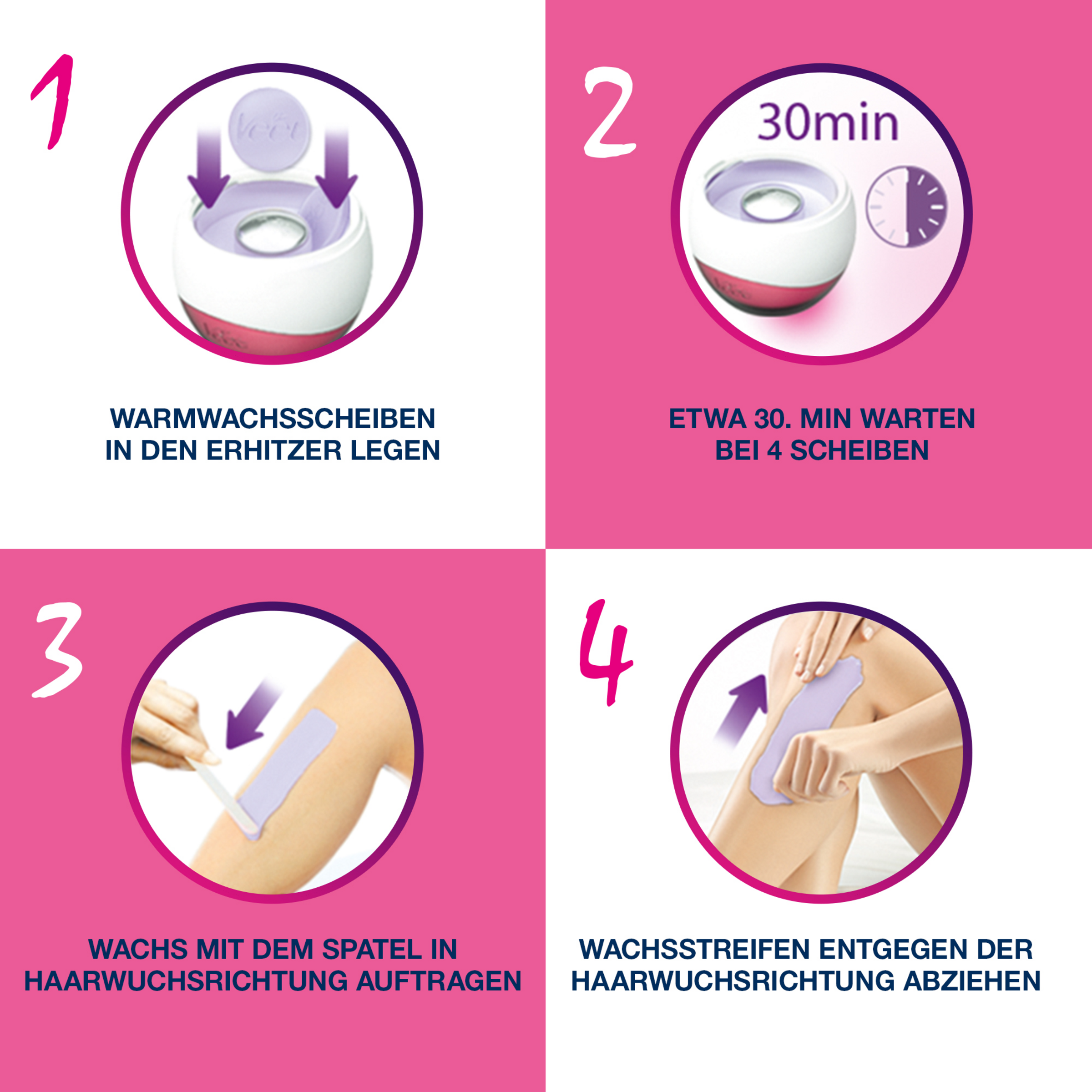Entwickelt für Beine, Arme, Achselhöhlen und Bikinizone.NICHT GEEIGNET für Gesicht, Kopf, Augen, Nase, Ohren, Brustwarzen, Genital- und Analbereich oder andere Körperpartien.Nicht verwenden auf Krampfadern, Narben, Muttermalen, bei geschädigter, gereizter Haut, Sonnenbrand oder bei vorangegangenen Hautreaktionen auf Enthaarungswachs. Warten Sie immer 72 Stunden bis zur nächsten Enthaarung.Bei Einnahme von Medikamenten, die die Haut beeinflussen können oder bei Hautkrankheiten, bitte vor der Anwendung einen Arzt konsultieren.Haarentfernung mit Wachs ist nicht für ältere Menschen, Diabetiker oder bei Einnahme von Retinoiden geeignet.FÜHREN SIE vor jeder Anwendung EINEN HAUTTEST DURCH, indem Sie das Produkt auf einer kleinen Stelle der zu enthaarenden Körperregion nach Gebrauchsanweisung anwenden. Wenn nach 24 STUNDEN keine Hautreaktionen auftreten, können Sie mit der Enthaarung fortfahren.Bei Brennen/Prickeln während der Anwendung, das Produkt sofort mit bereits benutztem Wachs oder Baby-Öl entfernen und gründlich mit viel kaltem Wasser abspülen. Wenn das Brennen anhält, ärztlichen Rat einholen.Nach der Anwendung kann die Haut für kurze Zeit empfindlicher sein, vermeiden Sie daher sich zu kratzen.Nach der Haarentfernung mit Wachs empfehlen wir, 24 Stunden zu warten bevor Sie Deo oder parfümierte Produkte auftragen, schwimmen gehen, ein Sonnenbad nehmen oder Bräunungsgeräte verwenden.NICHT IN REICHWEITE VON KINDERN AUFBEWAHREN.Bei Verschlucken sofort einen Arzt aufsuchen und Verpackung vorzeigen.Augenkontakt vermeiden. Bei Augenkontakt sofort mit viel Wasser abspülen und einen Arzt aufsuchen.Enthaarung mit Wachs ist auch für Schwangere geeignet, kann aber zu blauen Flecken führen.NUR mit dem Veet Elektrisches Warmwachs-Set verwenden. NICHT IN DER MIKROWELLE ERHITZEN.