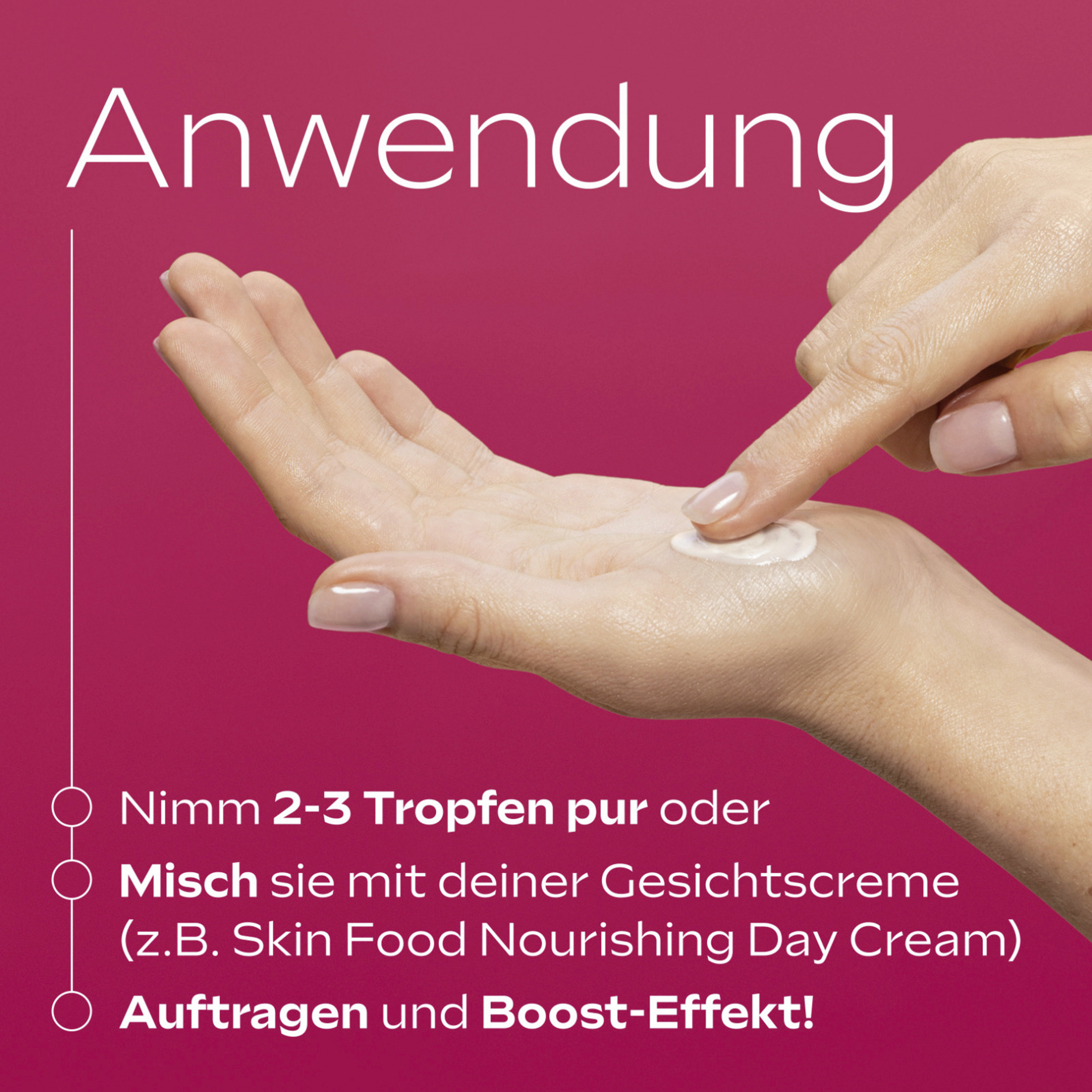 Trage 2–3 Tropfen auf die Haut auf oder mische sie mit deiner Gesichtscreme. Auftragen und Boost Effekt.