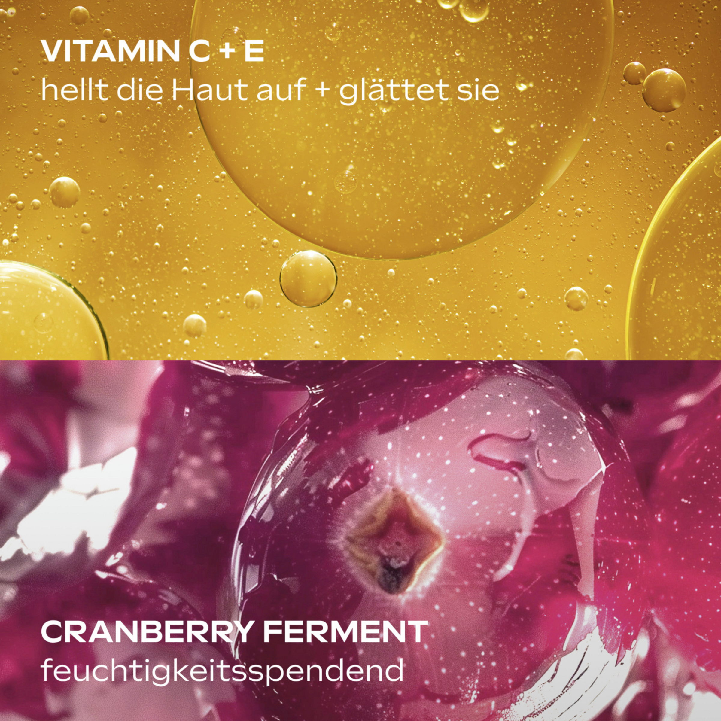 Booste deine Haut mit unserem Power-Trio aus Vitamin C, E und fermentierter Cranberry. Für ein reineres, strahlendes und ebenmässiges Hautbild. Dein perfektes Match, wenn du unreine und fahle Haut hast. Parfümfrei und zieht schnell ein.