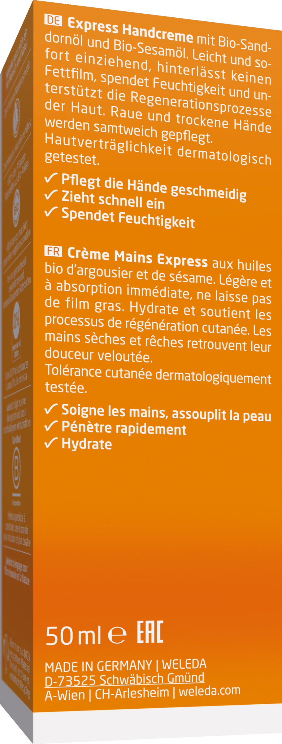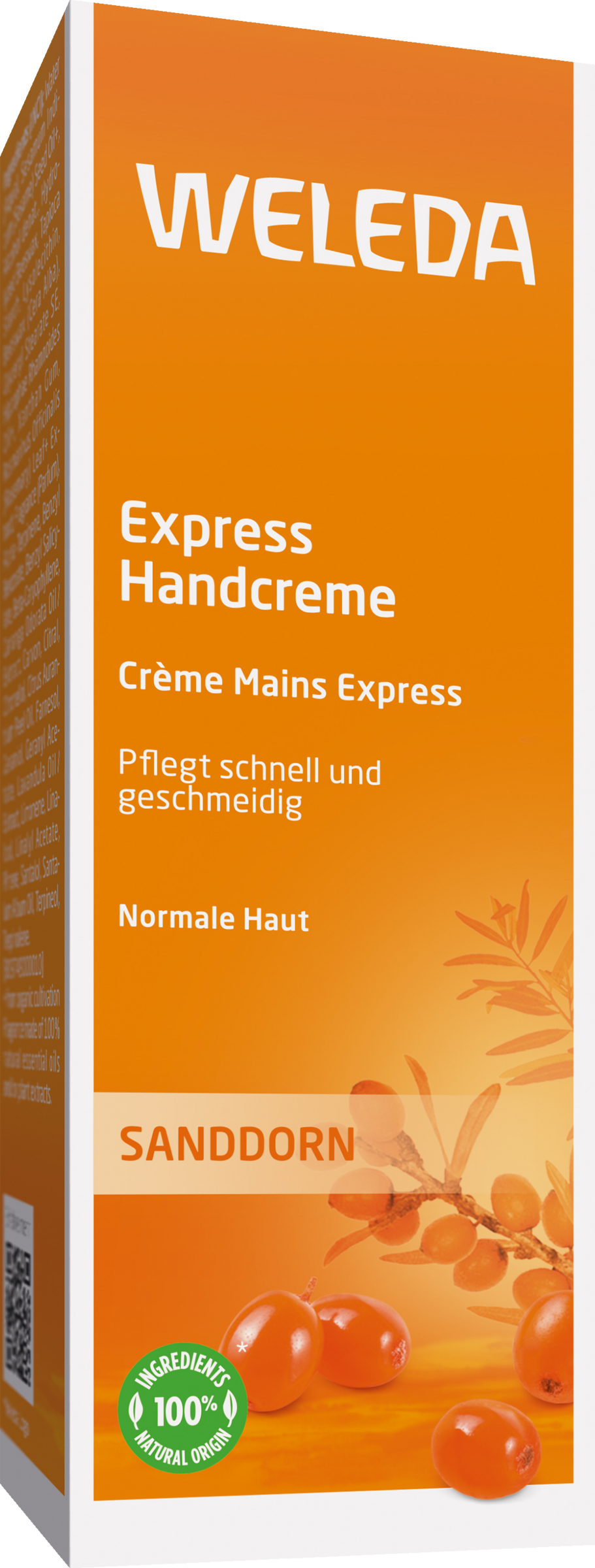 Die Weleda Sanddorn Express Handcreme ist perfekt für die schnelle Handpflege zwischendurch. Sie zieht besonders schnell und vollständig in die Haut ein und verwöhnt die Sinne durch ihren fruchtig frischen Citrusduft. Das wertvolle Sanddornöl ist reich an natürlichem Vitamin E und ungesättigten Fettsäuren und schützt so Haut und Nagelbett vor Fett- und Feuchtigkeitsverlust. Zusammen mit hautpflegendem Sesamöl reguliert es das gesunde Gleichgewicht der Haut, raue und strapazierte Hände werden weich und geschmeidig gepflegt.