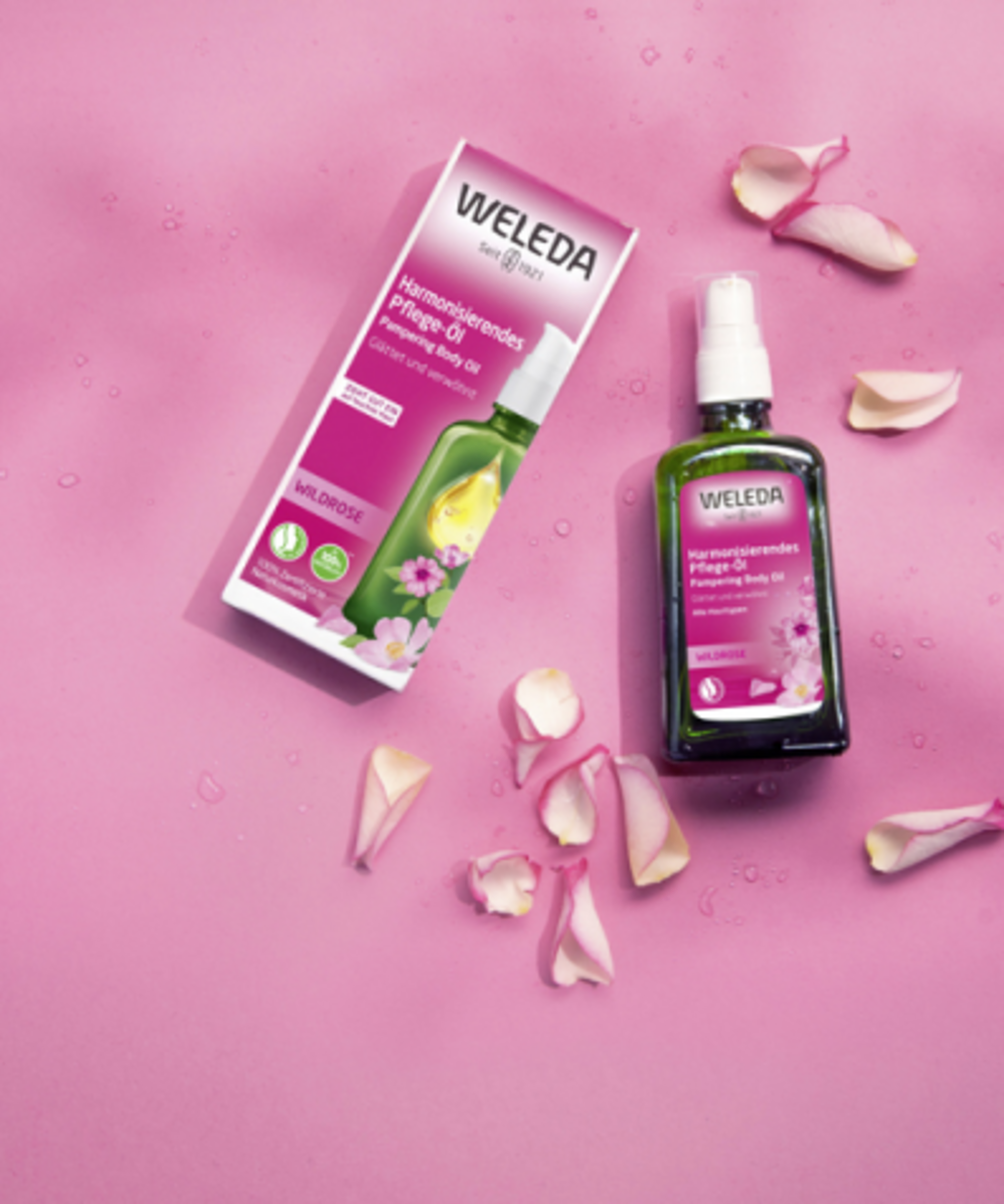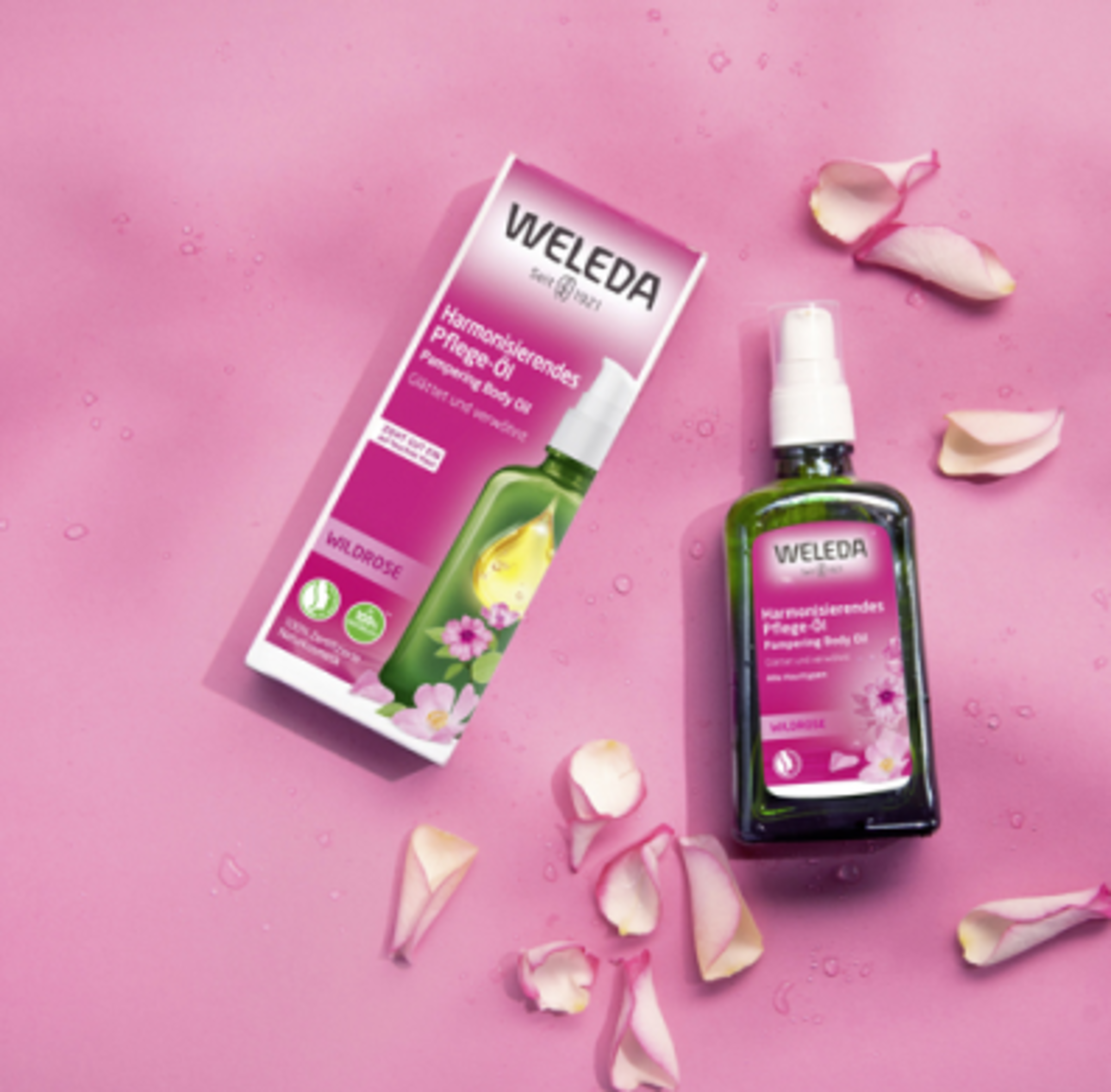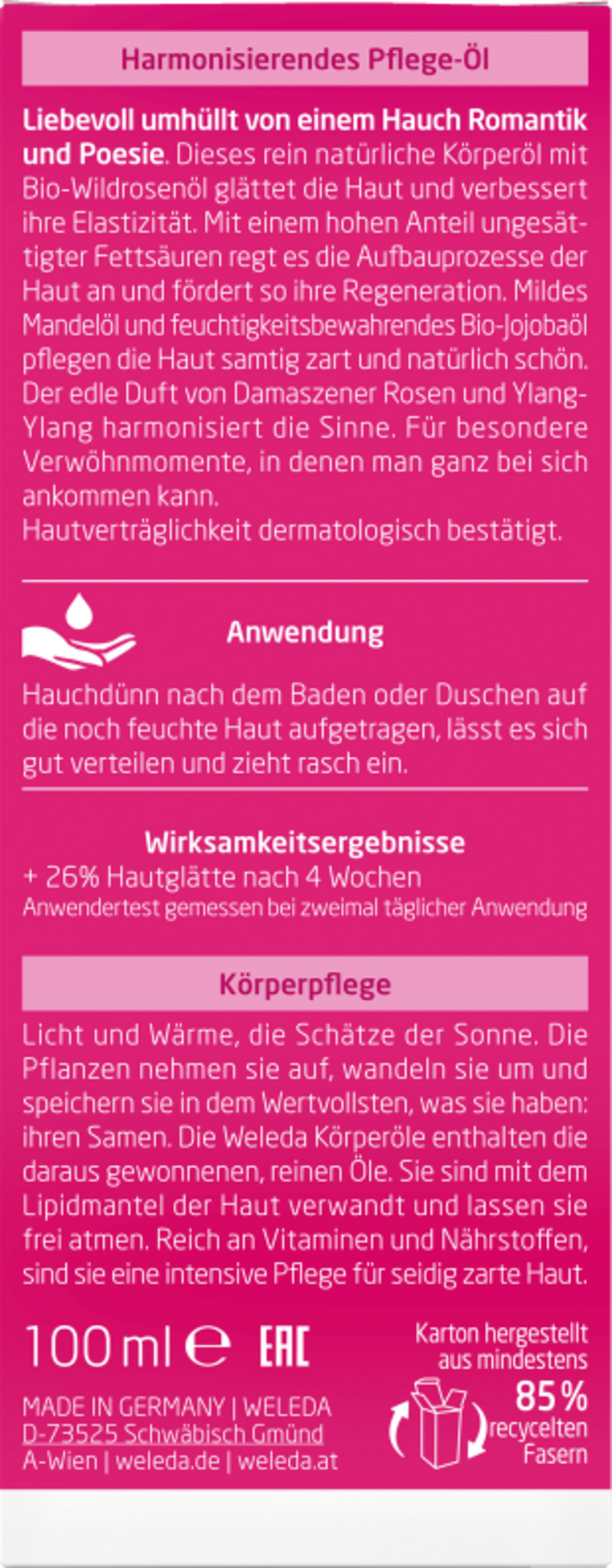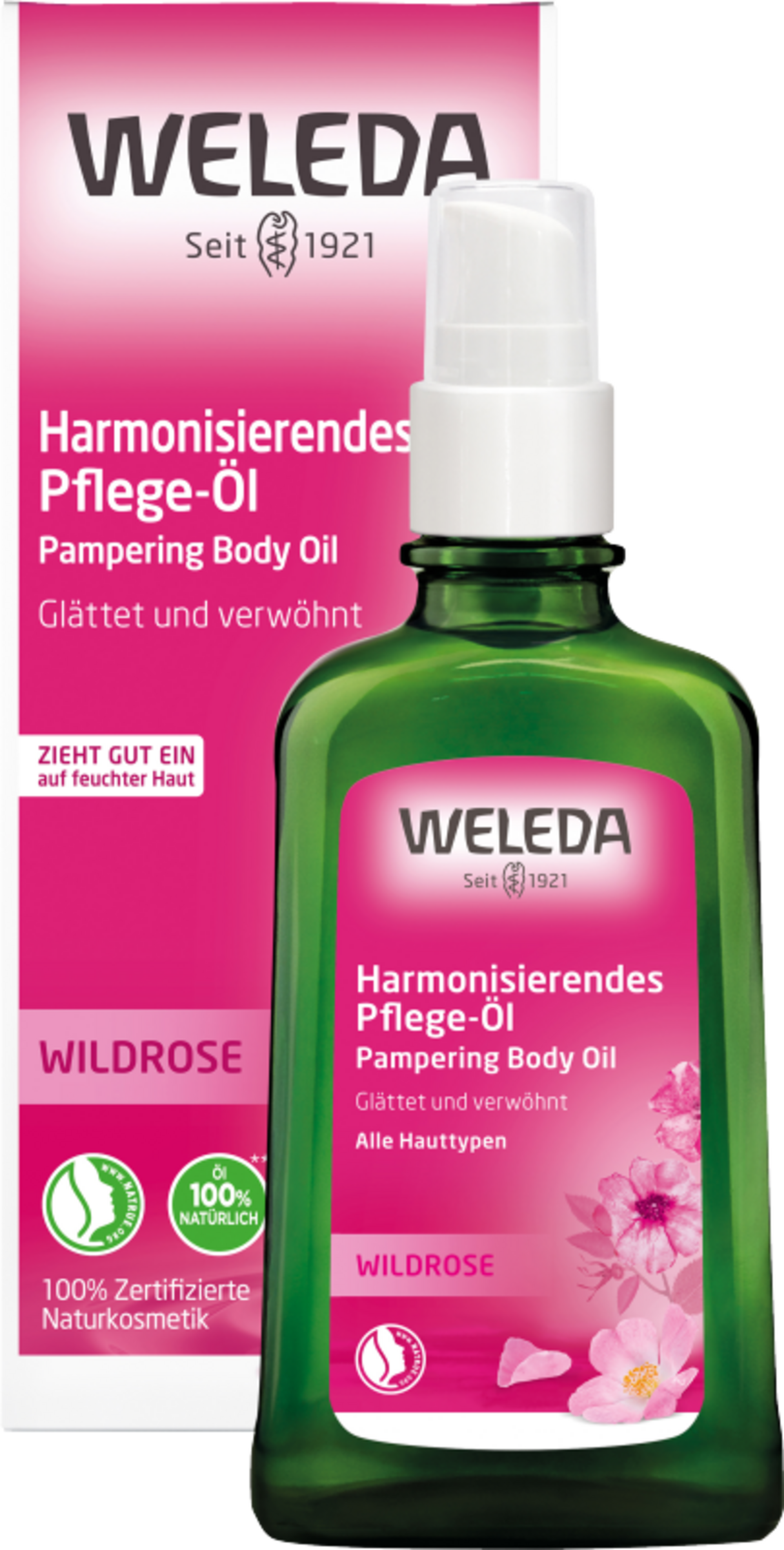 Das feine Mandelöl, feuchtigkeitsbewahrendes Jojobaöl und das besonders hochwertige Kernöl der wildwachsenden Rosa Mosqueta, das reich an ungesättigten Fettsäuren ist, verwöhnen die Haut und verleihen ihr Spannkraft und samtige Zartheit. Sie unterstützen den natürlichen Wärmeprozess des Menschen, indem sie den Körper in einen hauchzarten, atmungsaktiven Schutz warm einhüllen. Das ätherische Rosenöl, welches dem hochwertigen Körperöl seinen zartweichen Duft verleiht, wird aus eigens für Weleda biologisch angebauten Damaszenerrosen in der Türkei gewonnen. Das Weleda Wildrosen Harmonisierende Pflege-Öl ist ein duftender Stimmungsmacher, der Haut und Sinne sanft umschmeichelt.