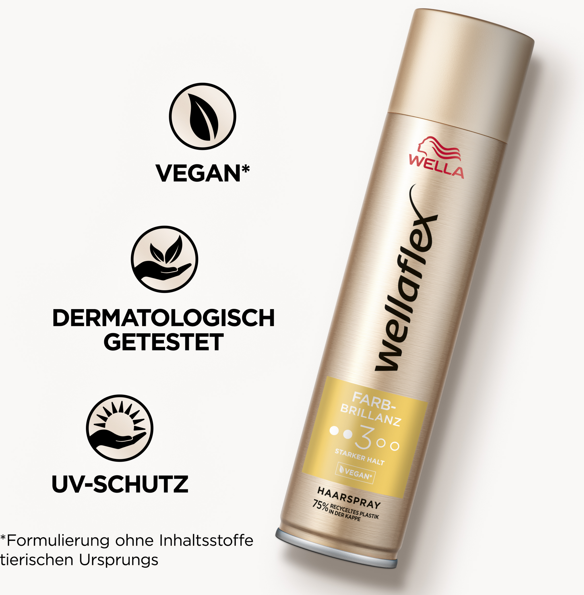 Gib Deinem colorierten Haar den Halt und den Glanz, das es verdient, mit dem Wellaflex Farbbrillanz Haarspray. Ein kopfhautschonendes, dermatologisch getestetes Haarspray für Frauen, das das Haar bis zu 48 Stunden lang natürlich und stilvoll aussehen lässt. Das vegane* Haarspray verleiht coloriertem Haar ein vollendetes, brillantes Finish und bietet gleichzeitig UV-Schutz vor Sonneneinstrahlungen. Zudem enthält die Verpackung eine Verschlusskappe aus 75 % recyceltem Plastik.