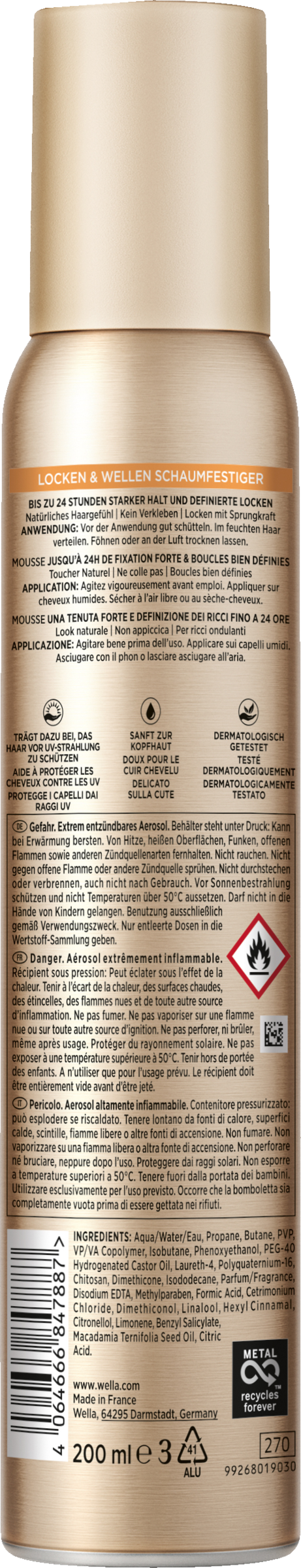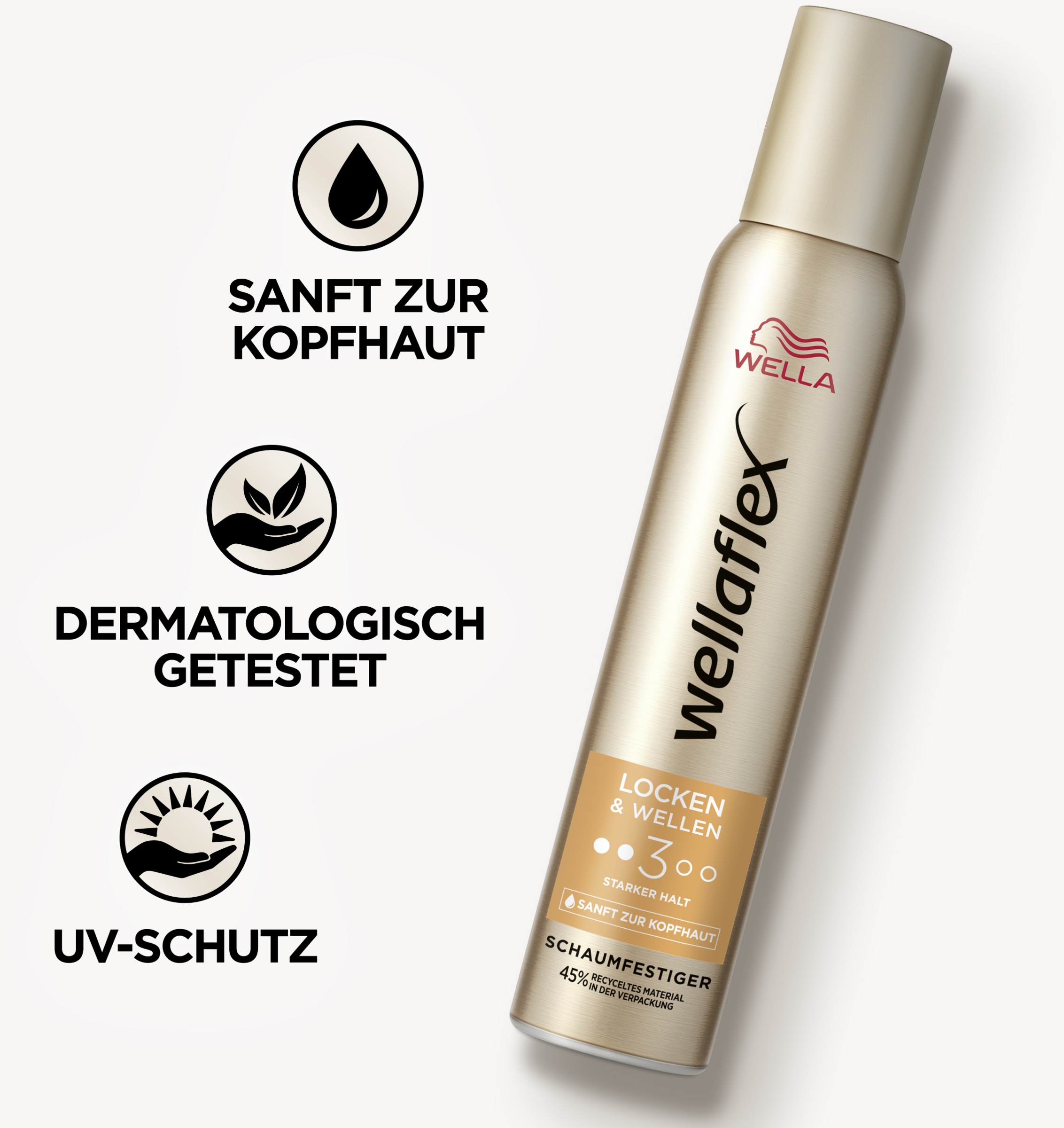 Genieße schwungvolle, definierte Locken für bis zu 24 Stunden mit dem Wellaflex Locken & Wellen Schaumfestiger. Ein kopfhautschonender, dermatologisch getesteter Stylingschaum, der lockiges Haar natürlich gestylt aussehen lässt, ohne es zu verkleben. Dieser Schaumfestiger ist frei von Silikonen, bietet UV-Schutz vor Sonneneinstrahlung und beinhaltet 45 % recyceltes Material in der Verpackung.
