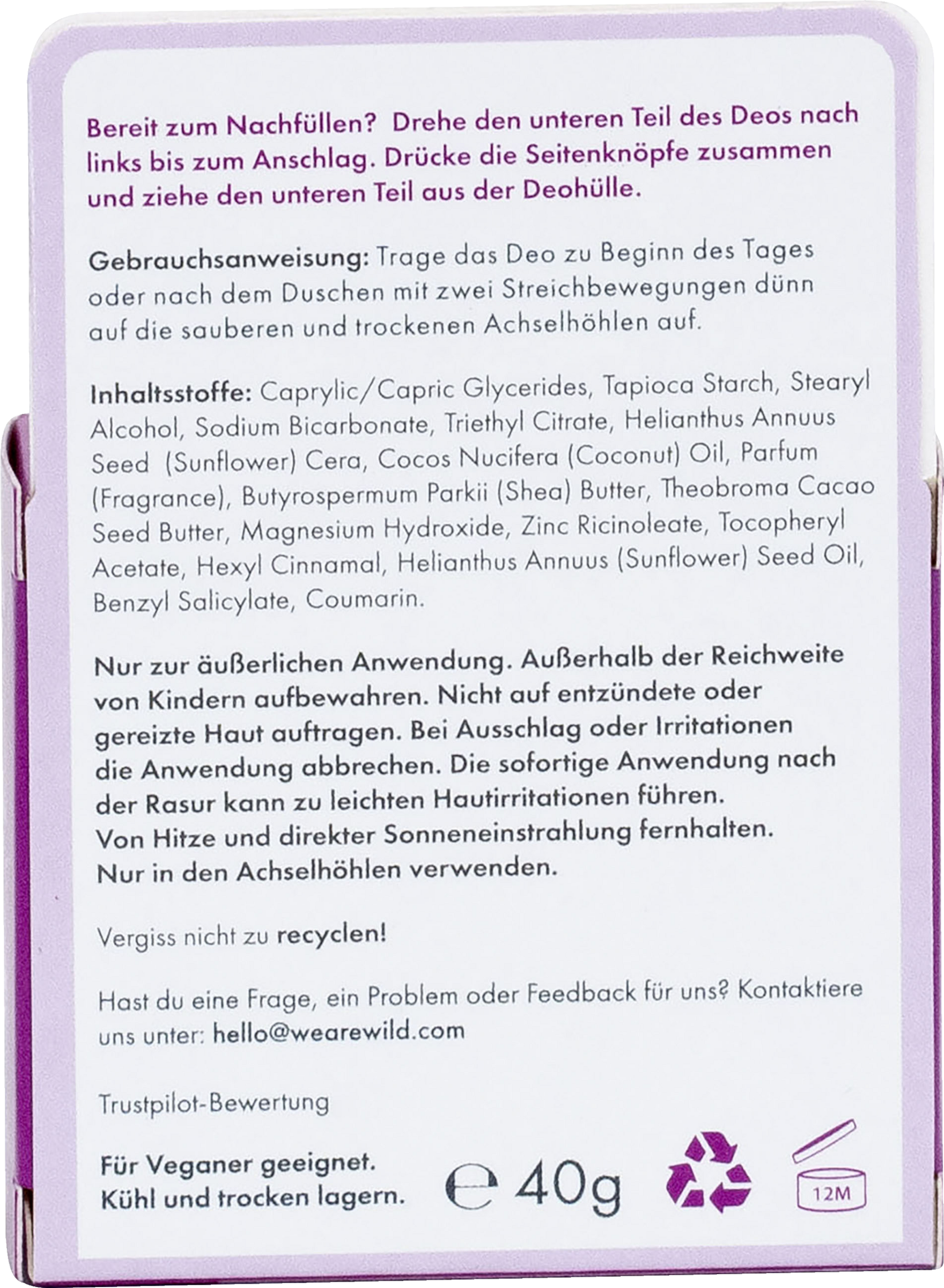 NACHFÜLLPACKUNG für WILD Deo Stick: Den Stick an der Unterseite herausdrehen und das Deo mit wenigen (2-3) Streichbewegungen dünn auf die Achseln auftragen. Beginne den Tag angenehm frisch! BEREIT ZUM NACHFÜLLEN? Drehe den unteren Teil des Deos nach links bis zum Anschlag. Drücke die Seitenknöpfe zusammen und ziehe den unteren Teil aus der Deohülle. Wechsel die Nachfüllpackung – fertig!
