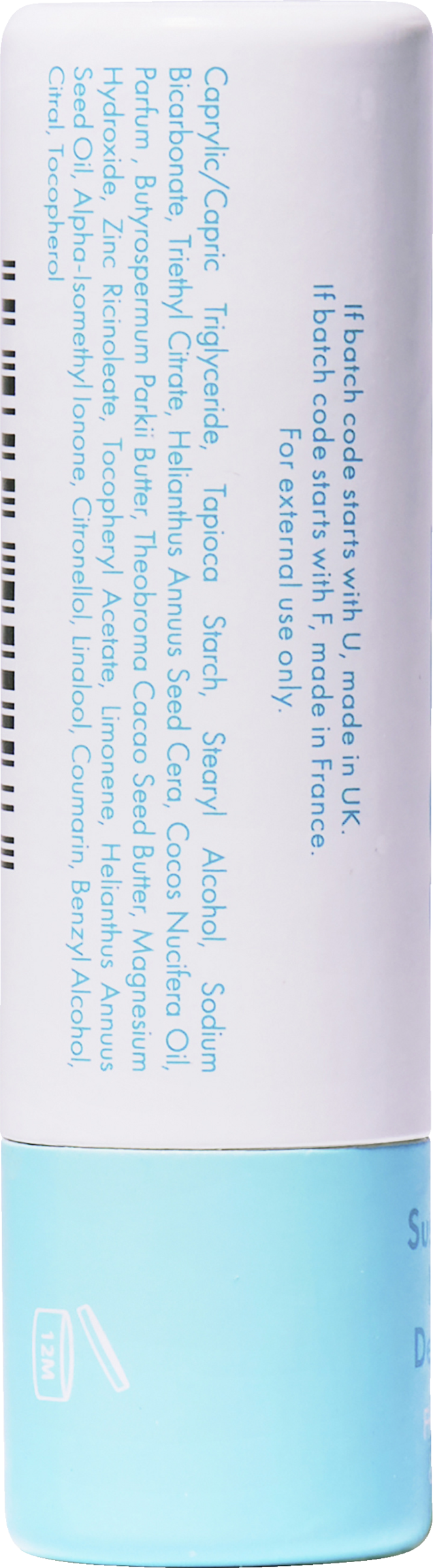 Caprylic/Capric Triglyceride, Tapioca Starch, Stearyl Alcohol, Sodium Bicarbonate, Triethyl Citrate, Helianthus Annuus Seed Cera, Cocos Nucifera Oil, Parfum, Butyrospermum Parkii Butter, Theobroma Cacao Seed Butter, Magnesium Hydroxide, Zinc Ricinoleate, Tocopheryl Acetate, Limonene, Helianthus Annuus Seed Oil, Alpha-Isomethyl Ionone, Citronellol, Linalool, Coumarin, Benzyl Alcohol, Citral, Tocopherol