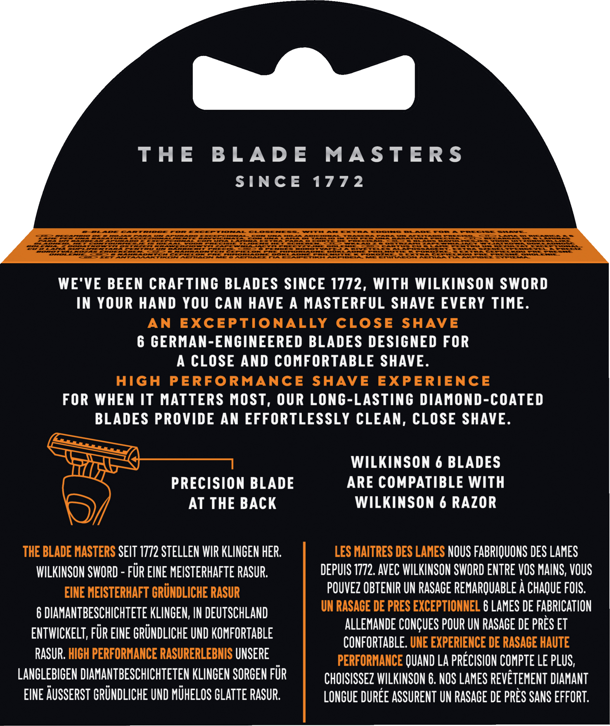 Erlebe eine unfassbar gründliche Rasur mit dem Wilkinson 6 High-Performance Rasierer. Der Klingenkopf besteht aus 6 diamantbeschichteten Klingen, die in Deutschland entwickelt wurden. Die Klingen sind perfekt angeordnet und lassen sich während und nach der Rasur leicht durchspülen. Zusätzlich sorgt ein Gleitstreifen für optimales Gleiten auf der Haut. Für noch mehr Präzision beim Styling oder an schwer zugänglichen Stellen hilft der Präzisionstrimmer auf der Rückseite des Klingenkopfes.