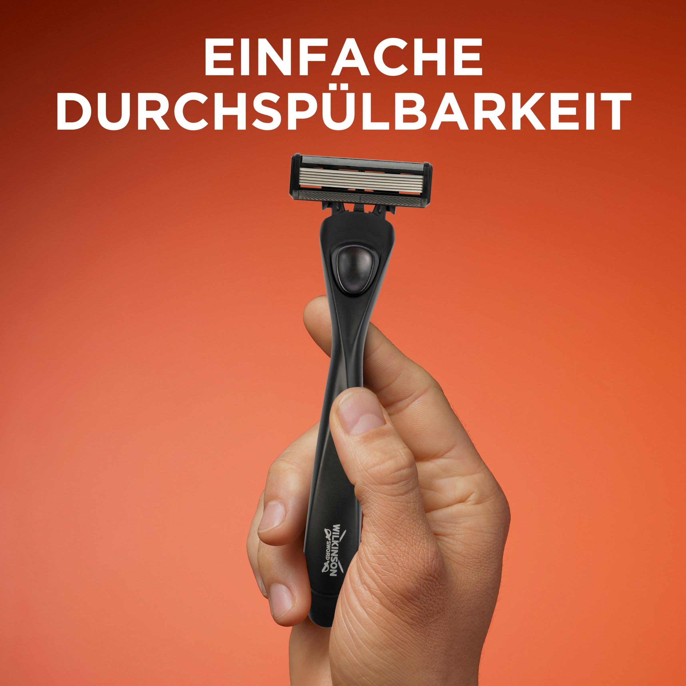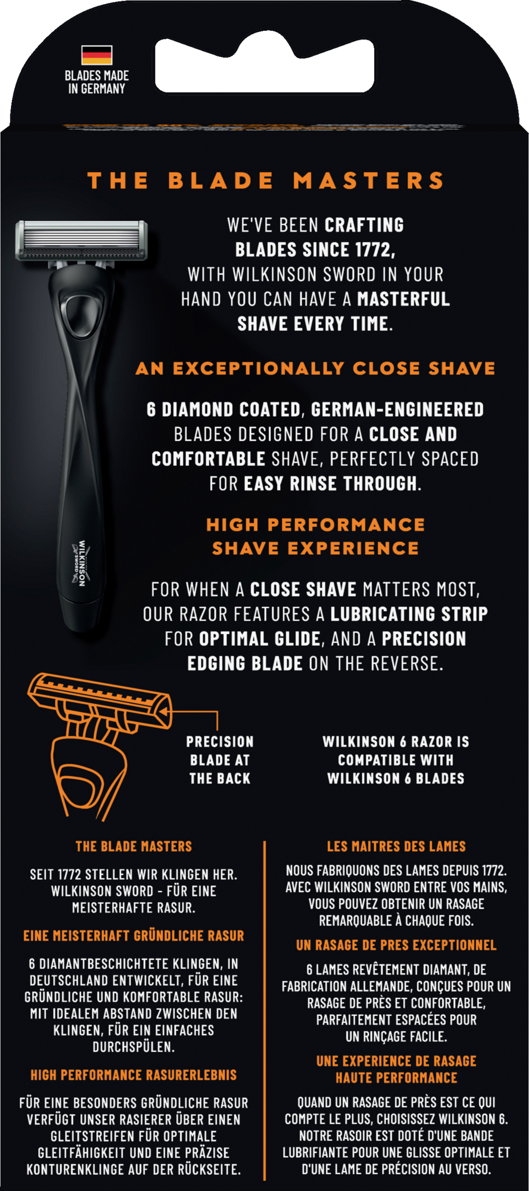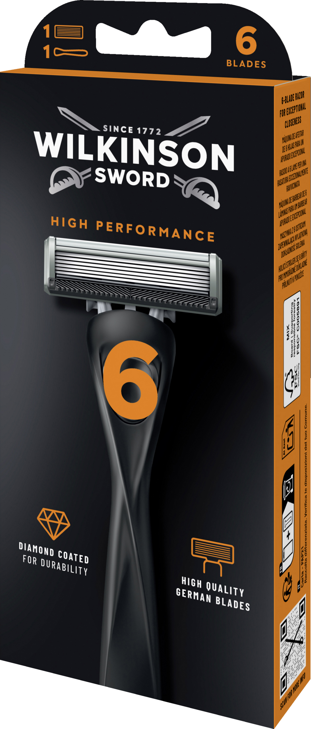Erlebe eine unfassbar gründliche Rasur mit dem Wilkinson 6 High-Performance Rasierer. Der Klingenkopf besteht aus 6 diamantbeschichteten Klingen, die in Deutschland entwickelt wurden. Die Klingen sind perfekt angeordnet und lassen sich während und nach der Rasur leicht durchspülen. Zusätzlich sorgt ein Gleitstreifen für optimales Gleiten auf der Haut. Für noch mehr Präzision beim Styling oder an schwer zugänglichen Stellen hilft der Präzisionstrimmer auf der Rückseite des Klingenkopfes.