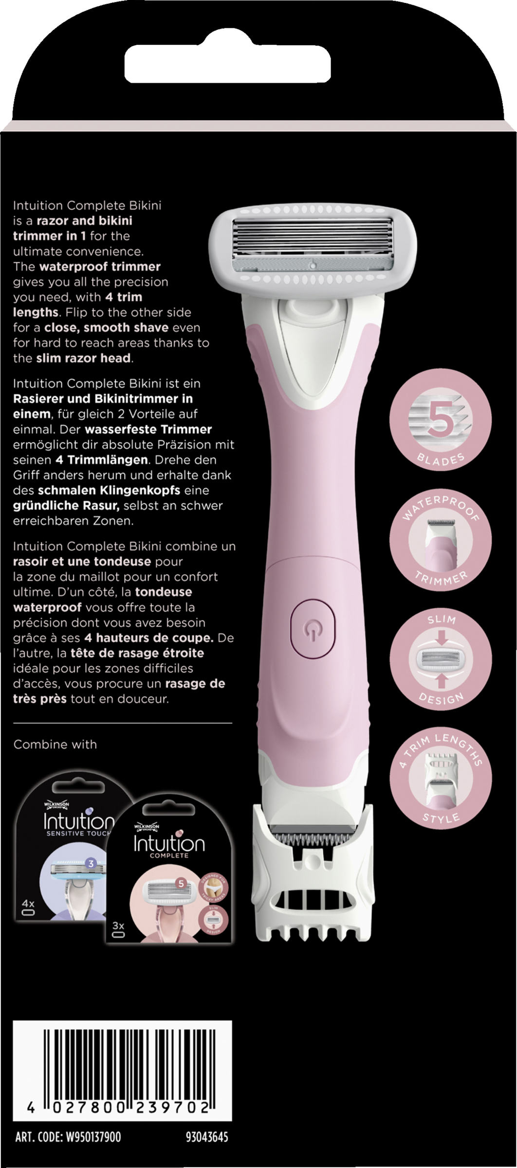 - gebogener Rasierkopf besonders geeignet für schwierige Zonen