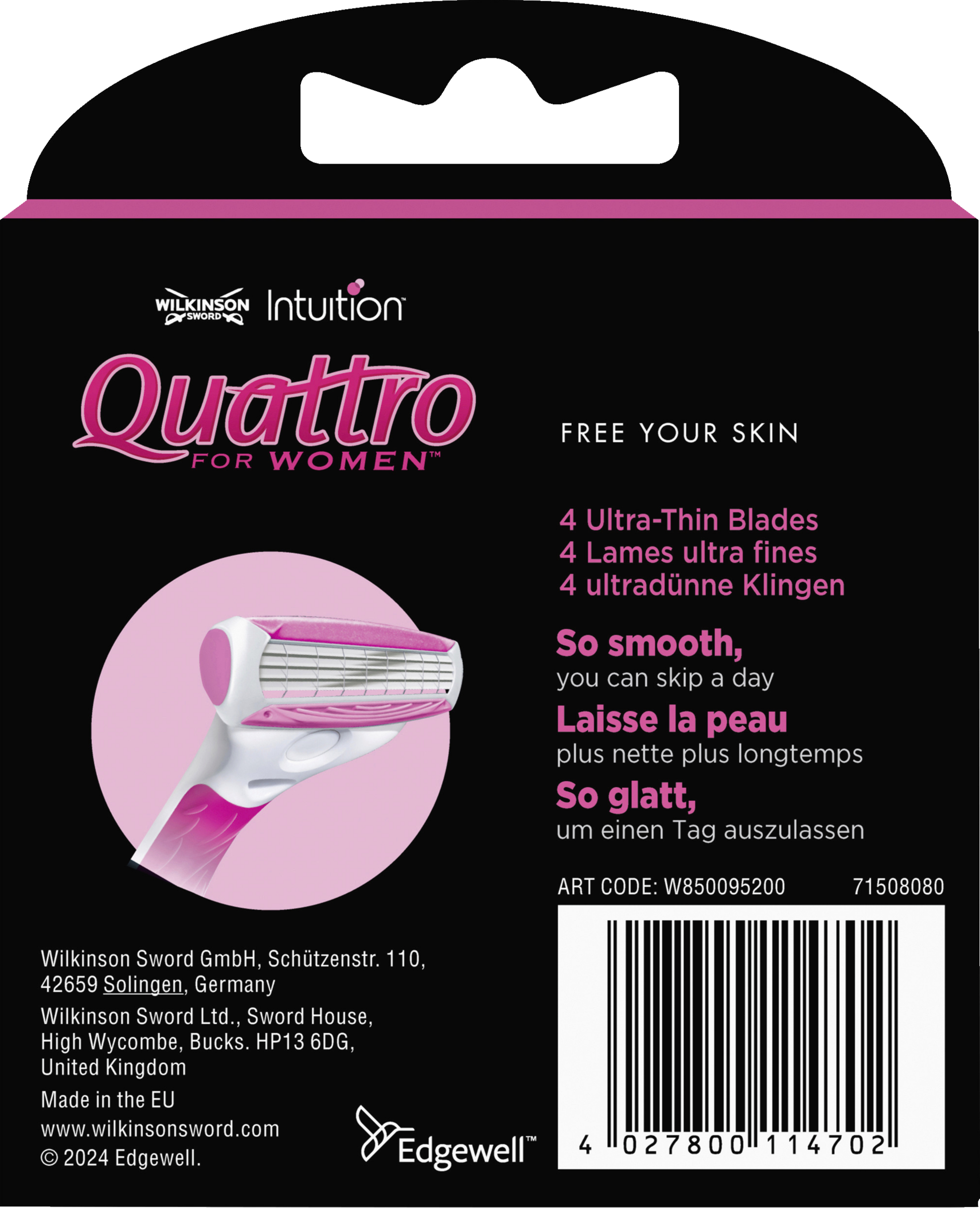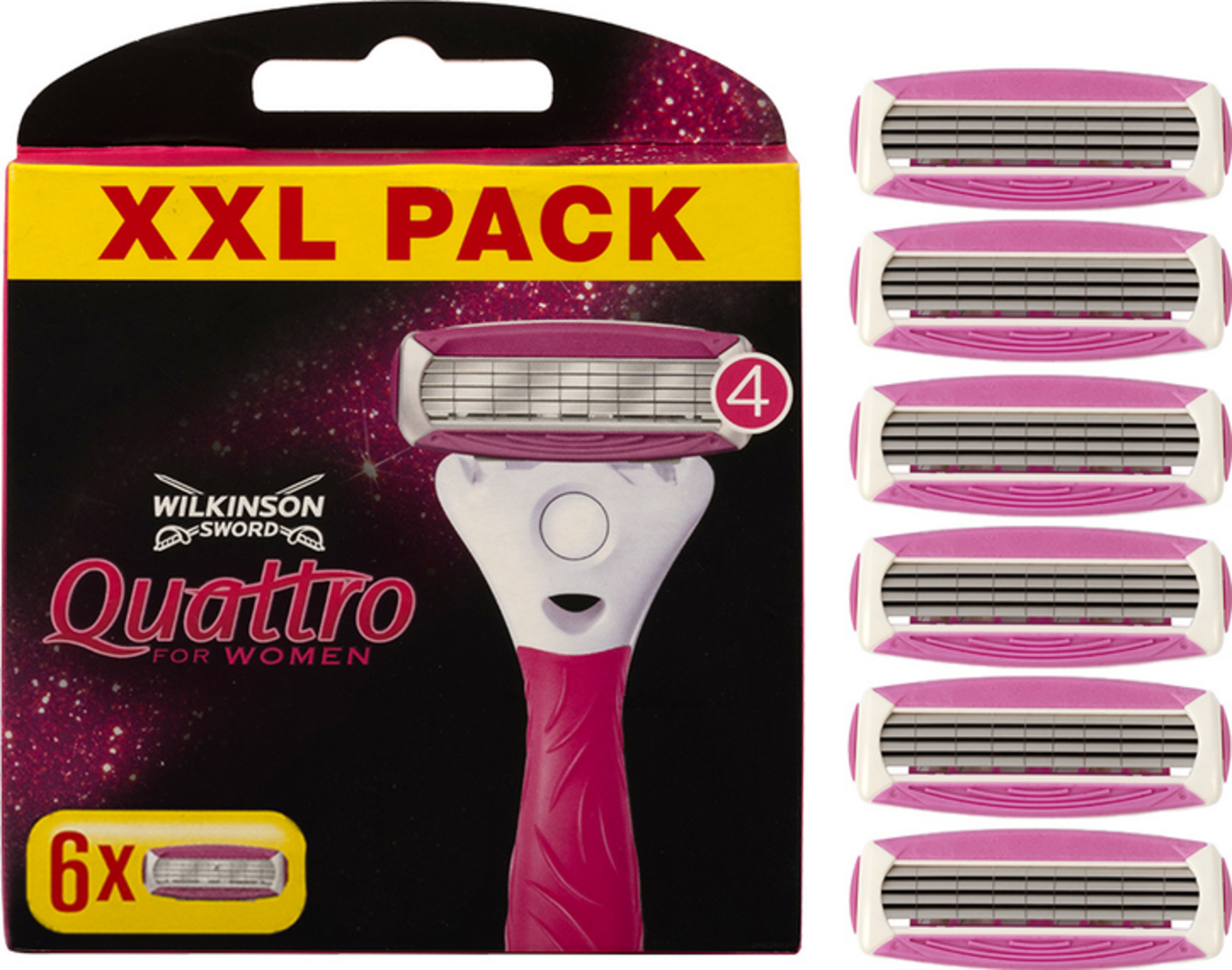 Der Quattro for Women Rasierer mit 4 ultradünnen Klingen und Schutzbügeln bietet eine gründliche Rasur und ist besonders einfach in der Handhabung. Ausgestattet mit Schutzbügeln zum Schutz vor Schnittverletzungen ist der Quattro for Women der ideale Einstiegrasierer und als täglicher Beauty-Begleiter.