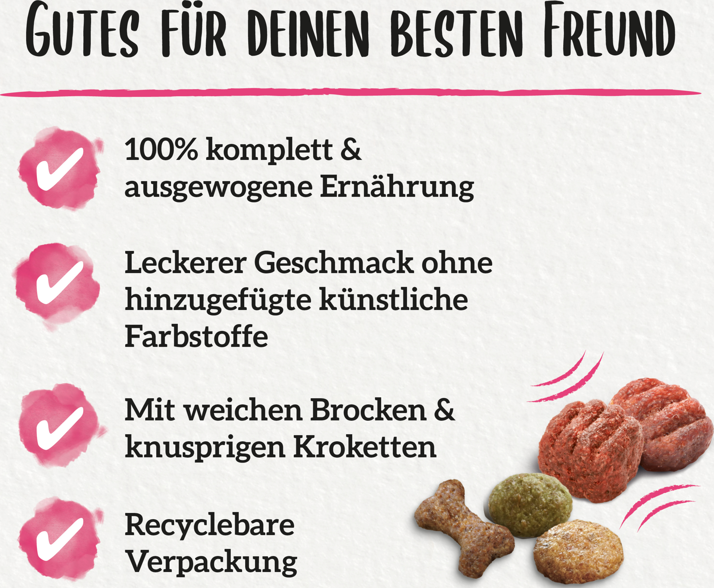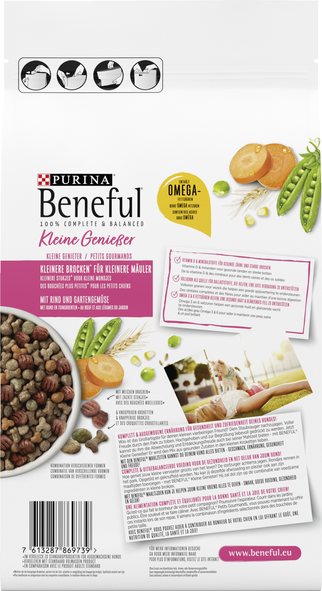 Was ist das Großartigste für deinen kleinen vierbeinigen Freund? Dem Staubsauger nachzujagen. Voller Freude durch den Park zu toben. Hochgehoben und zur Begrüssung liebevoll gedrückt zu werden. Jetzt kannst du ihm die Abwechslung und Entdeckungsfreude auch bei seiner Mahlzeit bieten - mit BENEFUL® Kleine Genießer! Er wird den Mix aus gesunden Zutaten in den kleinen Kroketten lieben. Mit den BENEFUL® Mahlzeiten kannst du deinem Hund alles bieten - Geschmack, Ernährung, Gesundheit und Freude!