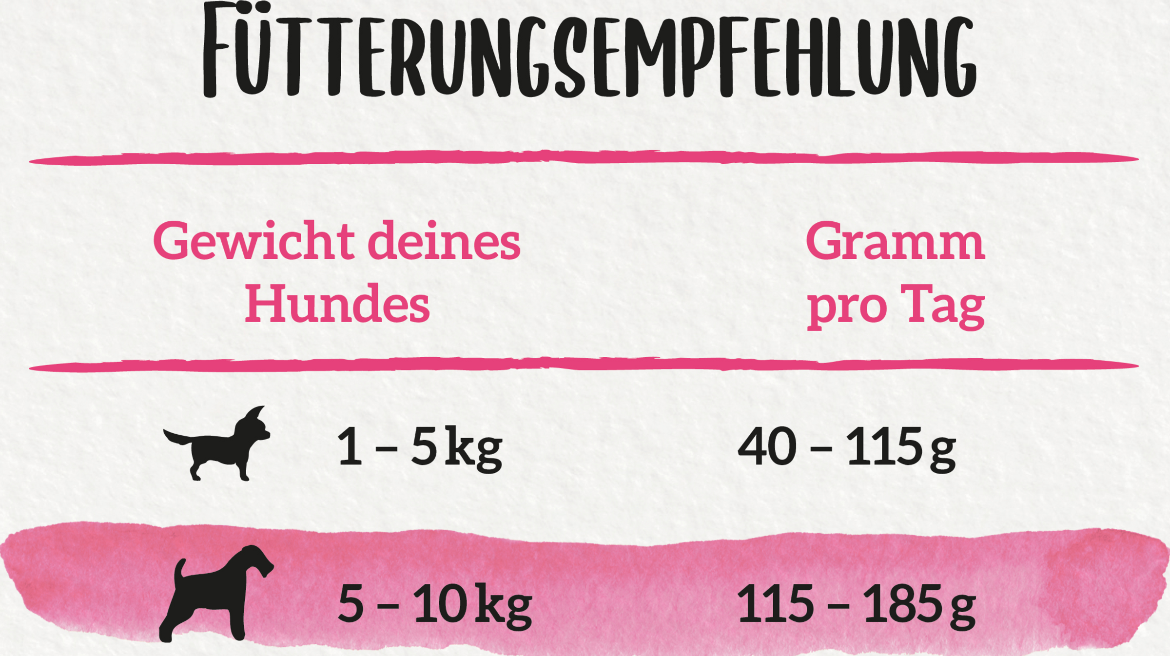 Gewicht des Hundes (kg)/Tägliche Fütterungsempfehlung (g/Tag):