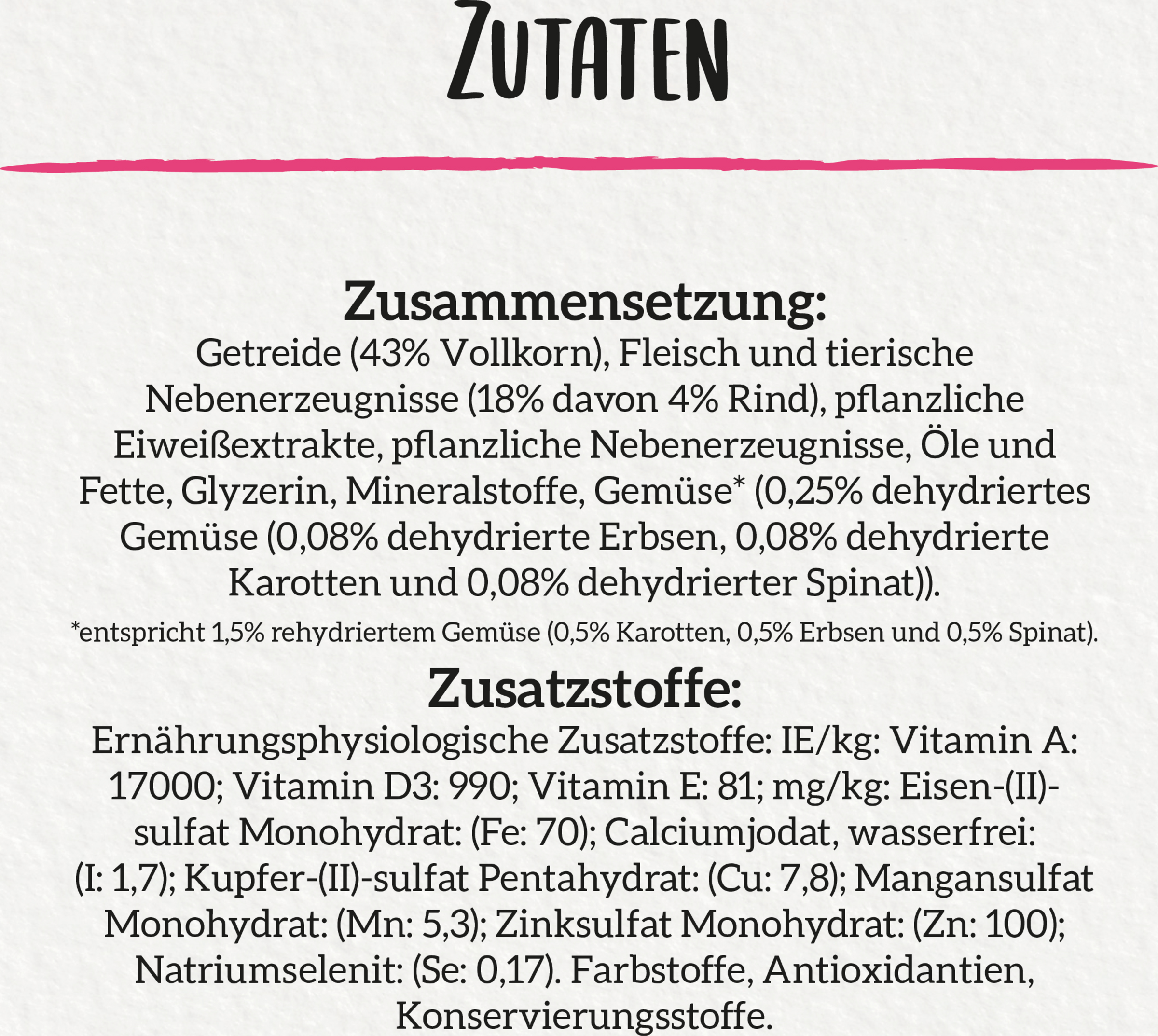 Getreide (43% Vollkorn), Fleisch und tierische Nebenerzeugnisse (18% davon 4% Rind), Pflanzliche Eiweißextrakte, Pflanzliche Nebenerzeugnisse, Öle und Fette, Glyzerin, Mineralstoffe, Gemüse* (0,25% dehydriertes Gemüse (0,08% dehydrierte Erbsen, 0,08% dehydrierte Karotten und 0,08% dehydrierter Spinat)). *entspricht 1,5% rehydriertem Gemüse (0,5% Karotten, 0,5% Erbsen und 0,5% Spinat).