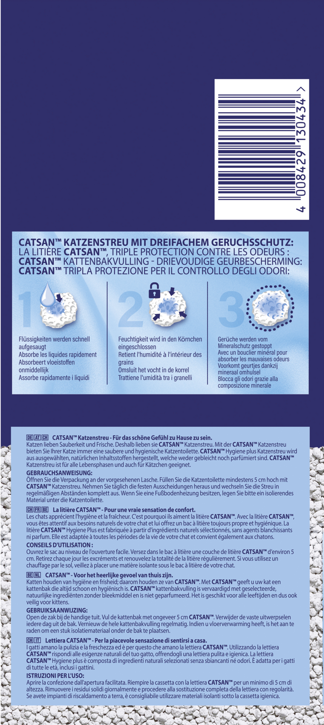 Die ungebleichten weißen Streukörner von CATSAN™ Hygiene Plus bestehen zu 100 % aus natürlichem Quarzsand und Kalk. Sie sind hochabsorbierend und schließen Flüssigkeit wie ein Schwamm in sich ein. Damit ist die Katzenstreu komplett geruchbindend.
