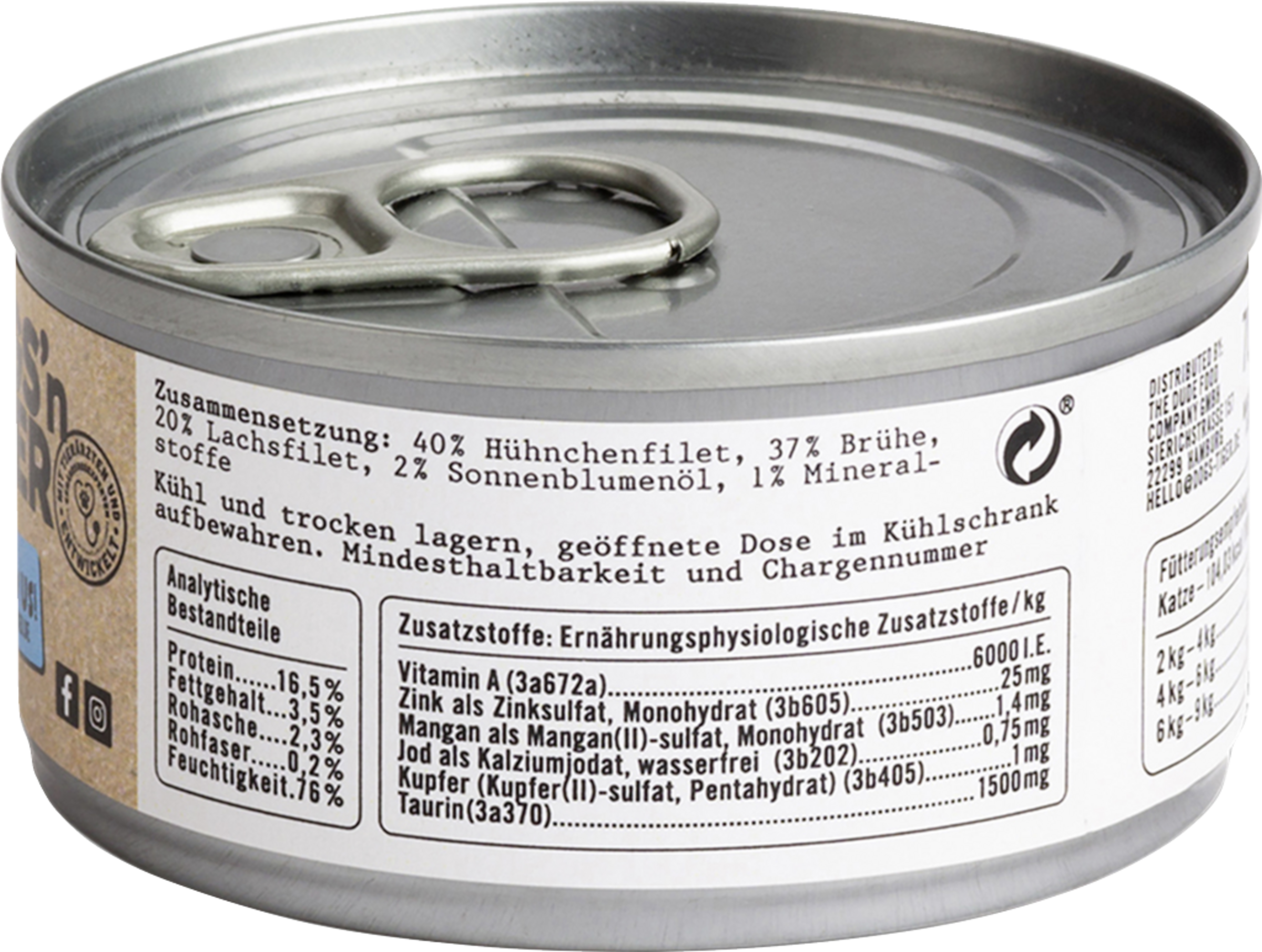 40% Hühnerfilet, 37% Brühe, 20% Lachsfilet, 2% Sonnenblumenöl, 1% Mineralstoffe