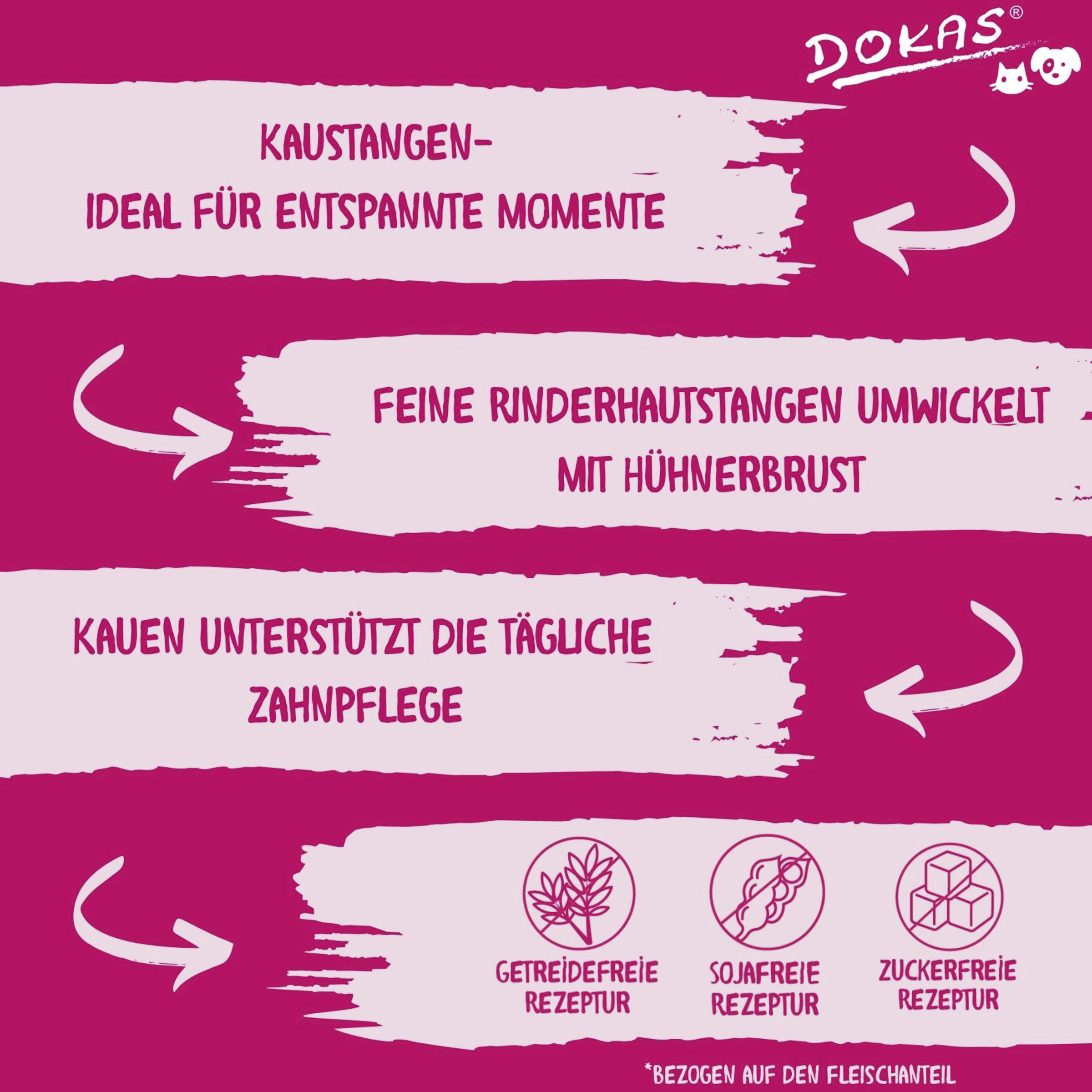 Rinderhautstangen mit feinem Hühnerbrustfilet umwickelt, sorgen für ein unübertreffliches Kauerlebnis. Durch intensives Kauen wird die Muskulatur gestärkt und nebenbei können die Kaustangen noch die tägliche Zahnpflege unterstützen.