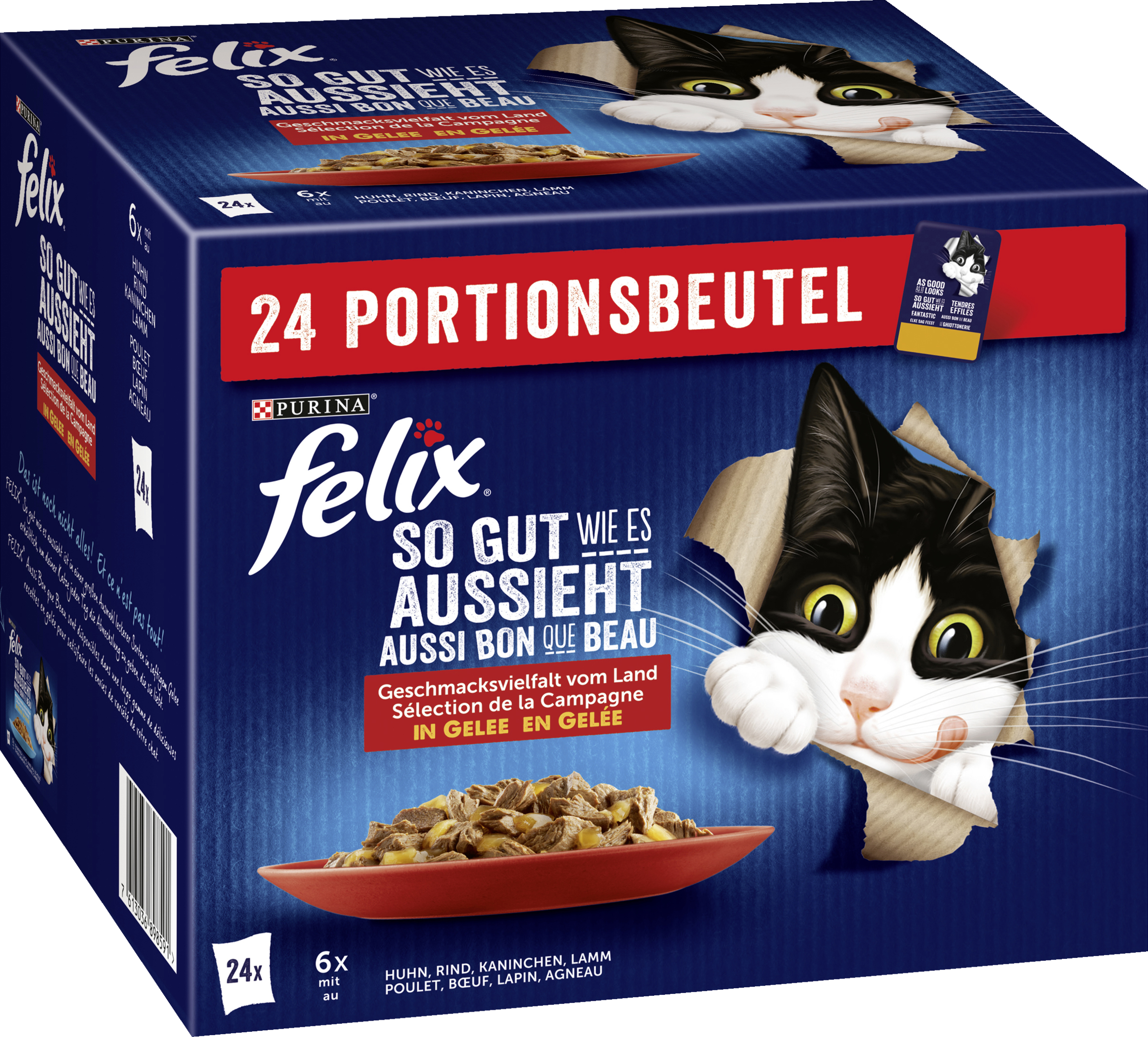 FELIX® So gut wie es aussieht® ist eine Auswahl unwiderstehlicher Mahlzeiten, die so lecker aussehen, riechen und schmecken, als hättest du sie selbst zubereitet! Jede Sorte, hergestellt mit hochwertigen Zutaten, besteht aus zarten Stücken in Gelee für eine leckere Mahlzeit, die deine Katze lieben wird! Sie sind auch eine Quelle von Omega-6-Fettsäuren mit der richtigen Kombination von Vitaminen, die deiner Katze helfen, voller Energie und für jeden Unfug bereit zu sein! Diese Fülle an guten Zutaten deckt bei Fütterung nach der Fütterungsempfehlung den Tagesbedarf deiner Katze zu 100%. Das ist noch nicht alles! FELIX® So gut wie es aussieht® ist in einer großen Auswahl leckerer Sorten in saftigem Gelee erhältlich, um deiner Katze jeden Tag die Abwechslung zu geben, die sie liebt. Sie schmecken wirklich so gut, wie sie aussehen! FELIX® - einfach unwiderstehlich!