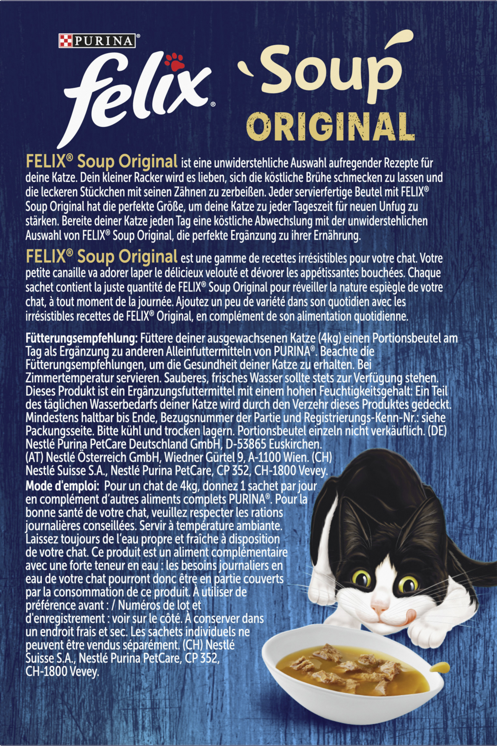 PURINA® FELIX® SOUP ist eine unwiderstehliche Auswahl aufregender Rezepte für deine Katze. Dein kleiner Racker wird es lieben, sich die köstliche Brühe schmecken zu lassen und die leckeren Stückchen mit seinen Zähnen zu zerbeißen. Jeder servierfertige Beutel mit FELIX® Soup hat die perfekte Größe, um deine Katze zu jeder Tageszeit für neuen Unfug zu stärken. Du kannst es mit einem guten Gefühl füttern, denn es ist ohne Zusatz von künstlichen Farb-, Aromen- oder Konservierungsstoffen. Bereite deiner Katze jeden Tag eine köstliche Abwechslung mit der unwiderstehlichen Auswahl von FELIX® Soup, die perfekte Ergänzung zu ihrer Ernährung.6 x Geschmacksvielfalt aus dem Wasser enthält: