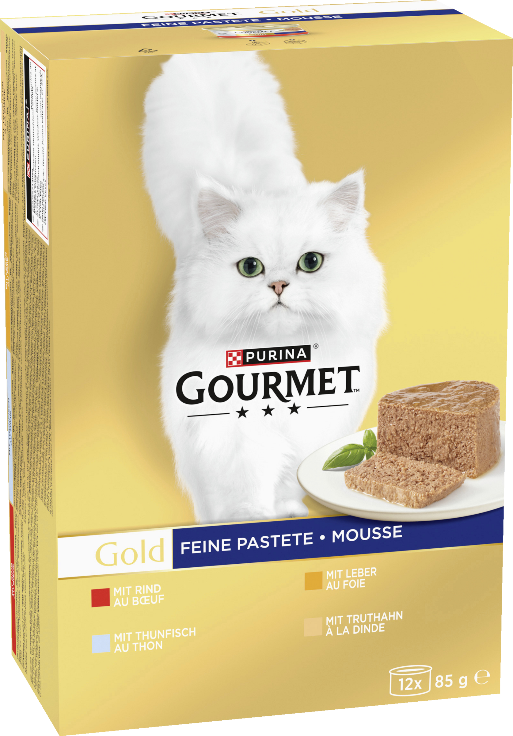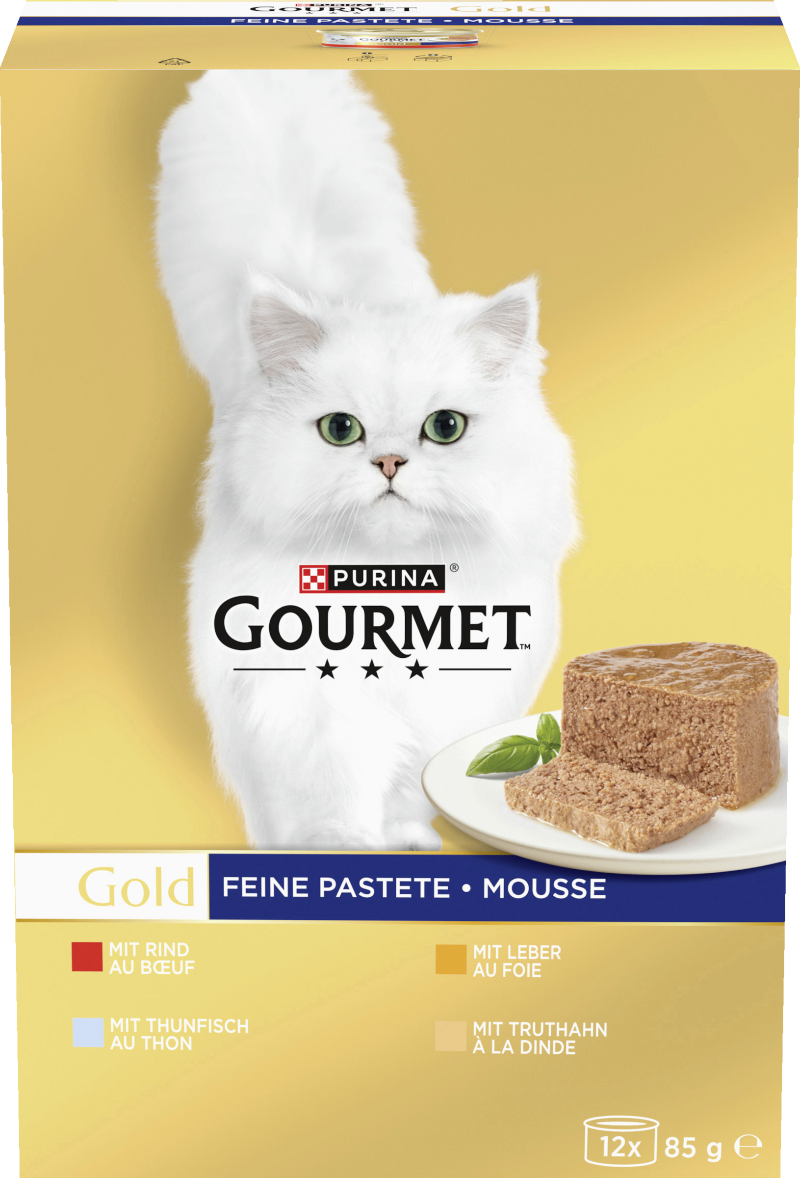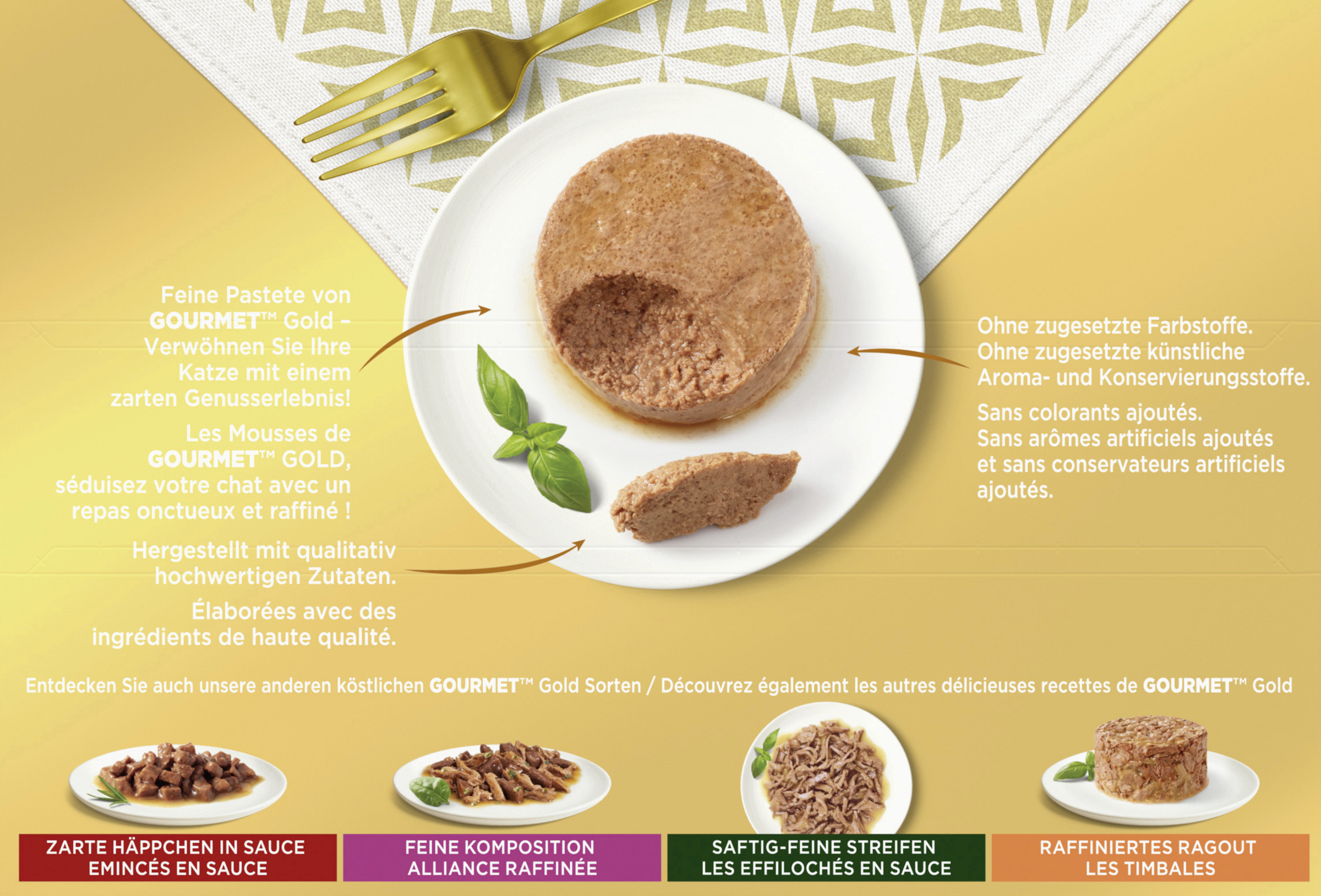 GOURMET Gold Feine Pastete - Köstliche Pasteten mit Rind, Huhn, Lachs und anderen ausgewählten Zutaten wurden sorgfältig zubereitet, um Ihrer Katze eine zarte Überraschung zu bieten.
