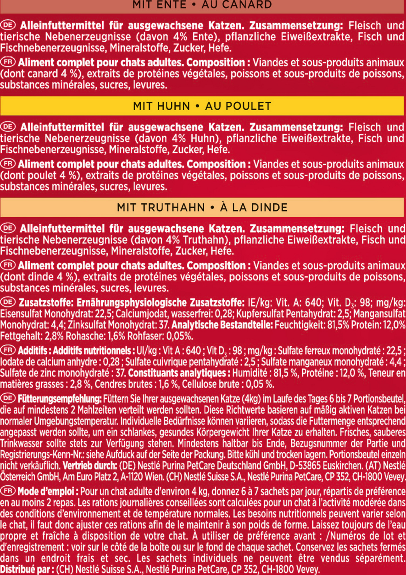 Fleisch und tierische Nebenerzeugnisse (davon 4% Truthahn), pflanzliche Eiweißextrakte, Fisch und Fischnebenerzeugnisse,Mineralstoffe, Zucker.Erlesene Streifen mit ThunfischFleisch und tierische Nebenerzeugnisse,pflanzliche Eiweißextrakte, Fisch und Fischnebenerzeugnisse (4% Thunfisch),Mineralstoffe, Zucker.Erlesene Streifen mit EnteFleisch und tierische Nebenerzeugnisse (davon 4% Ente), pflanzliche Eiweißextrakte, Fisch und Fischnebenerzeugnisse,Mineralstoffe, Zucker.Erlesene Streifen mit Lamm Fleisch und tierische Nebenerzeugnisse (davon 4% Lamm), pflanzliche Eiweißextrakte, Fisch und Fischnebenerzeugnisse,Mineralstoffe, Zucker.Die folgenden Informationen gelten für alle Varietäten: