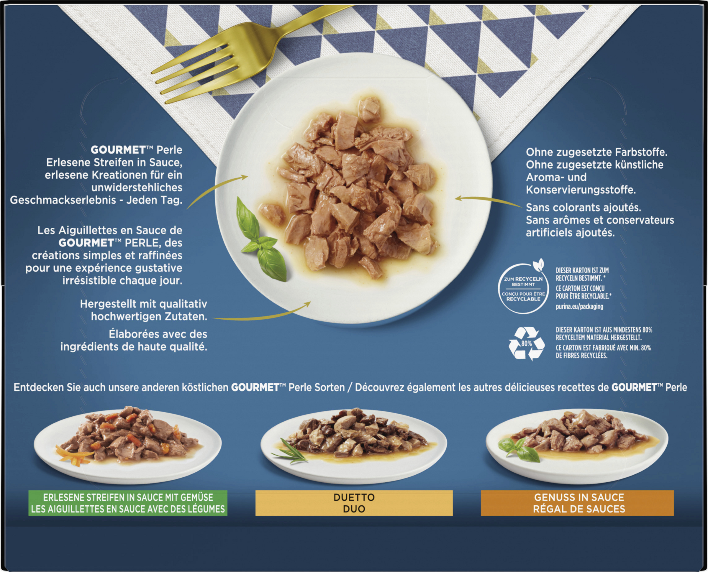 GOURMET™ Perle Erlesene Streifen in Sauce, erlesene Kreationen für ein unwiderstehliches Geschmackserlebnis - Jeden Tag. Alle GOURMET™ Perle Erlesene Streifen in Sauce Sorten werden mit qualitativ hochwertigen Zutaten hergestellt und sind ohne zugesetzte Farbstoffe sowie ohne zugesetzte künstliche Aroma- und Konservierungsstoffe.