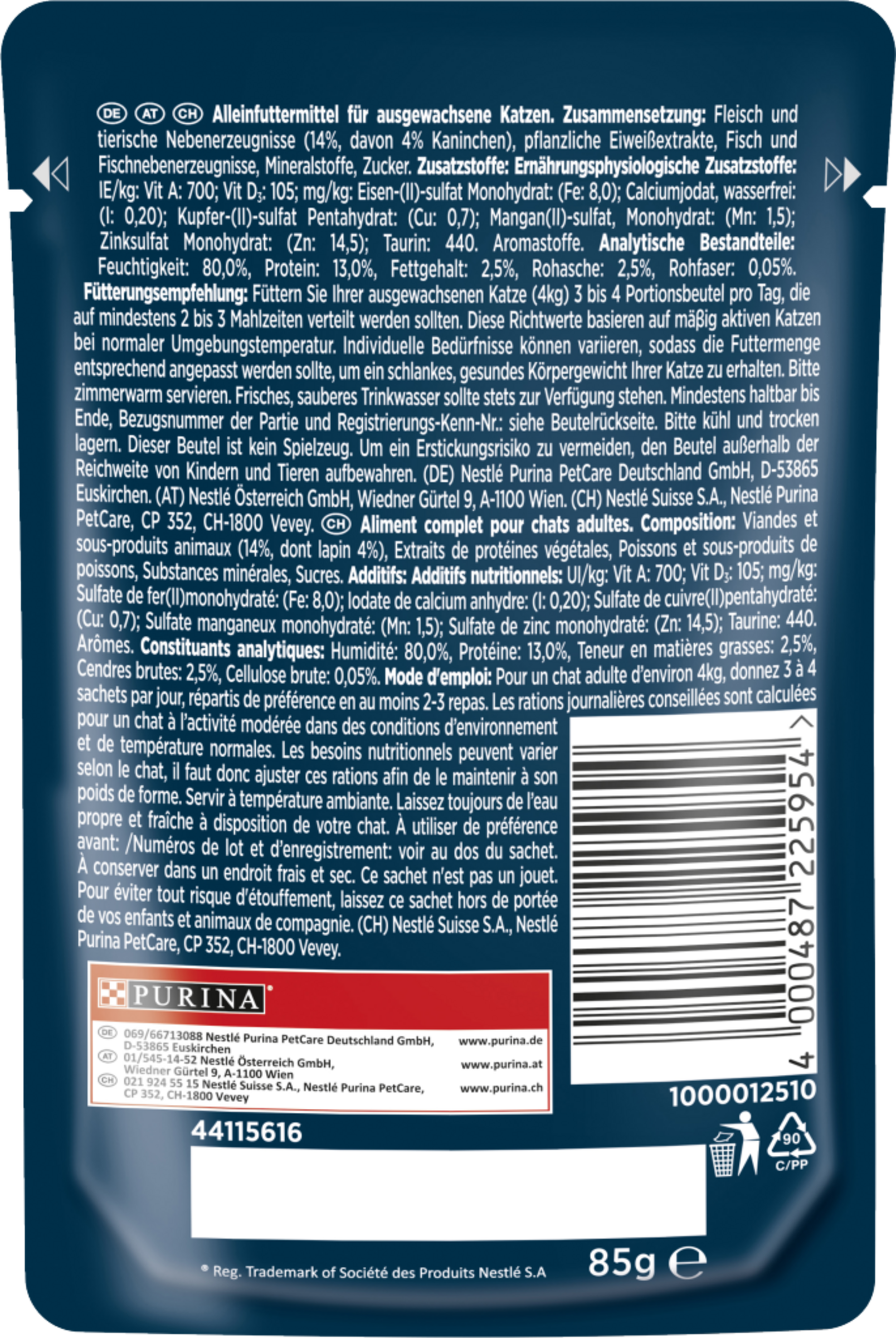 Füttern Sie Ihrer ausgewachsenen Katze (4kg) 3 bis 4 Portionsbeutel pro Tag, die auf mindestens 2 bis 3 Mahlzeiten verteilt werden sollten. Diese Richtwerte basieren auf mäβig aktiven Katzen bei normaler Umgebungstemperatur. Individuelle Bedürfnisse können variieren, so dass die Futtermenge entsprechend angepasst werden sollte, um ein schlankes, gesundes Körpergewicht Ihrer Katze zu erhalten. Bitte zimmerwarm servieren. Sauberes, frisches Wasser sollte stets zur Verfügung stehen.