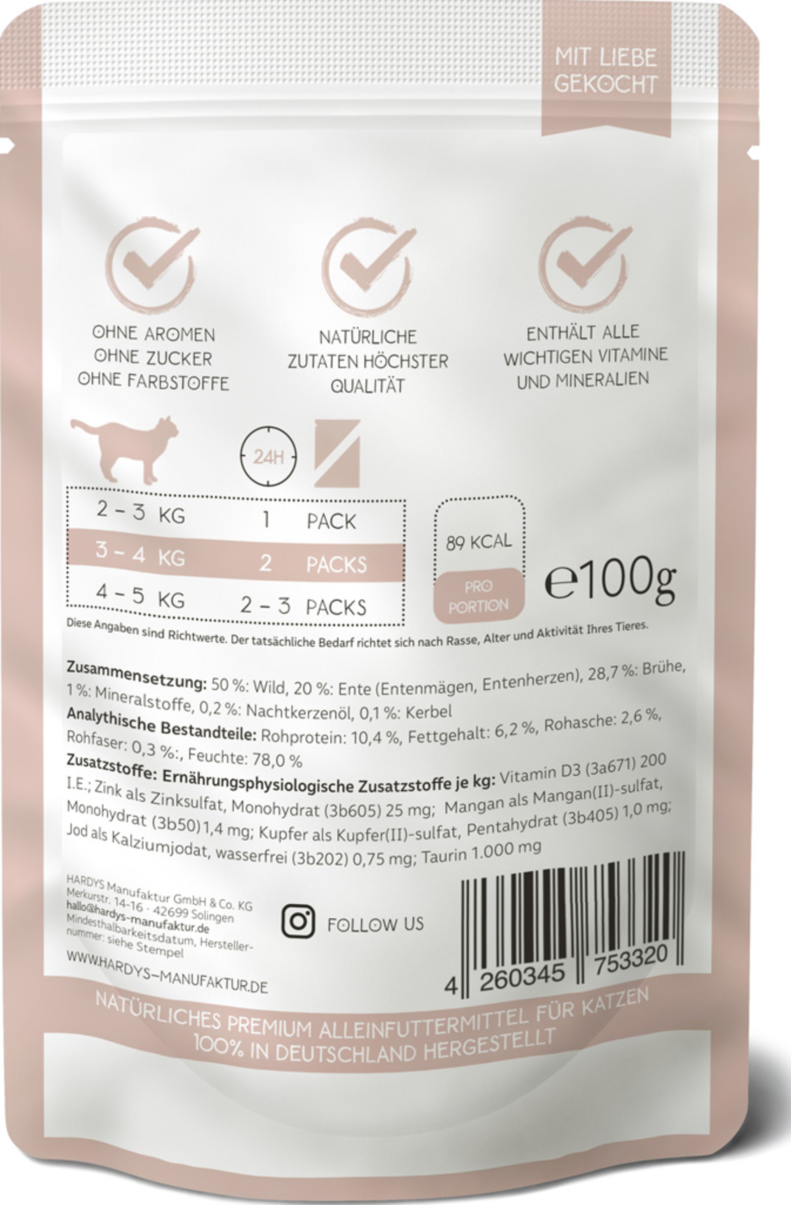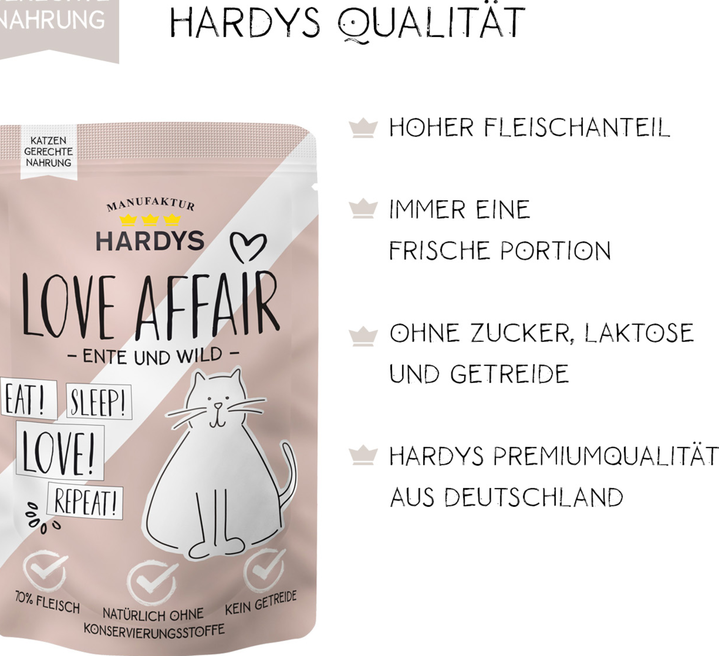 HARDYS LoveAffair Spezialitäten werden sorgfältig hergestellt und zwar ausschließlich in Deutschland. Dabei verwenden wir bei HARDYS am liebsten heimische Zutaten die vitaminschonend gegart werden. Zartes hochwertiges Fleisch, wertvolle Innereien und die feine Portion Nachtkerzenöl versorgen Ihre Katze mit allen wichtigen Nährstoffen und Omega Fettsäuren. Frei von Getreide, Zucker, künstlichen Aromen und Konservierungsstoffen.