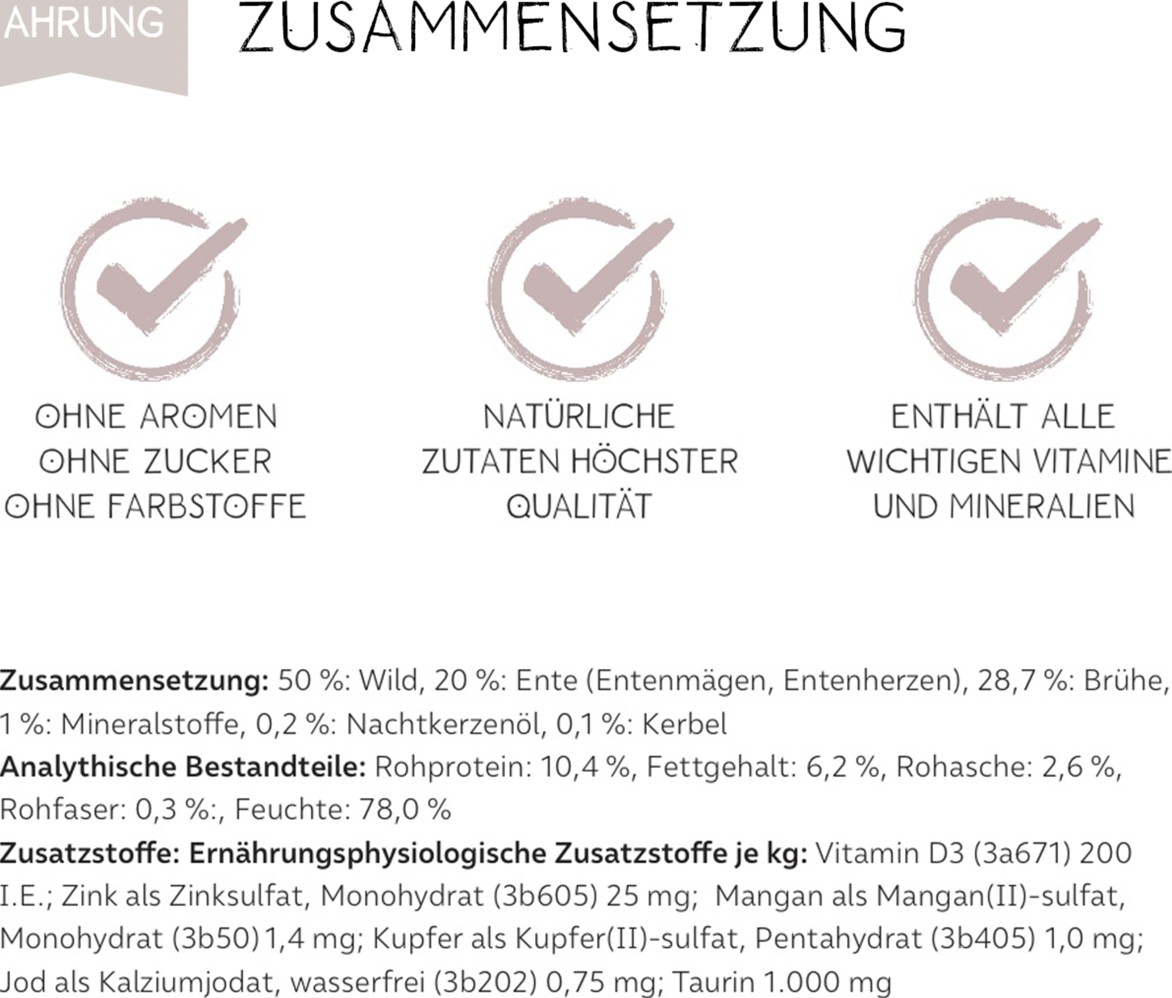 50% Wild, 20% Ente (Entenmägen, Entenherzen), 28,7% Brühe, 1% Mineralstoffe, 0,2% Nachtkerzenöl, 0,1% Kerbel