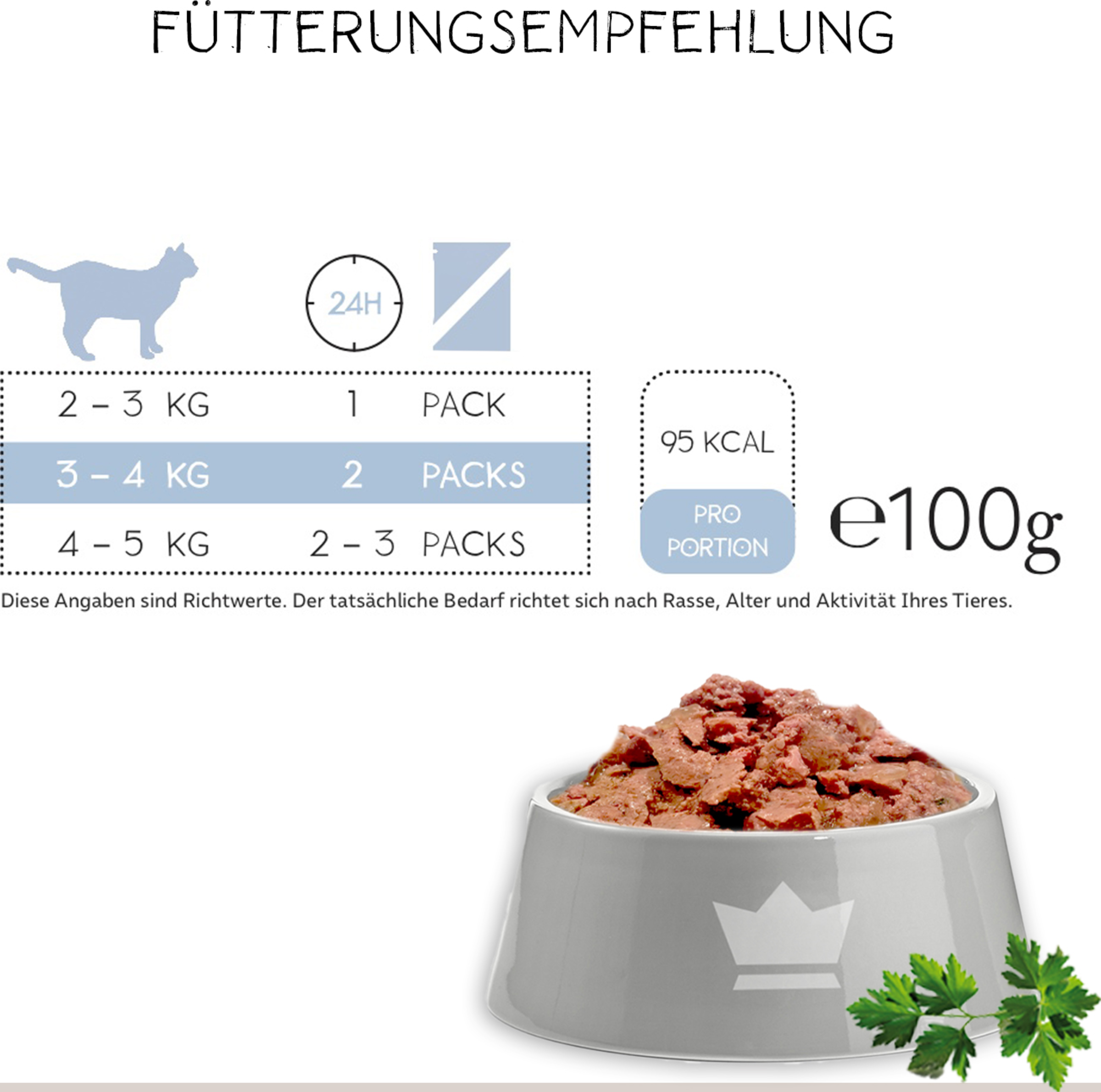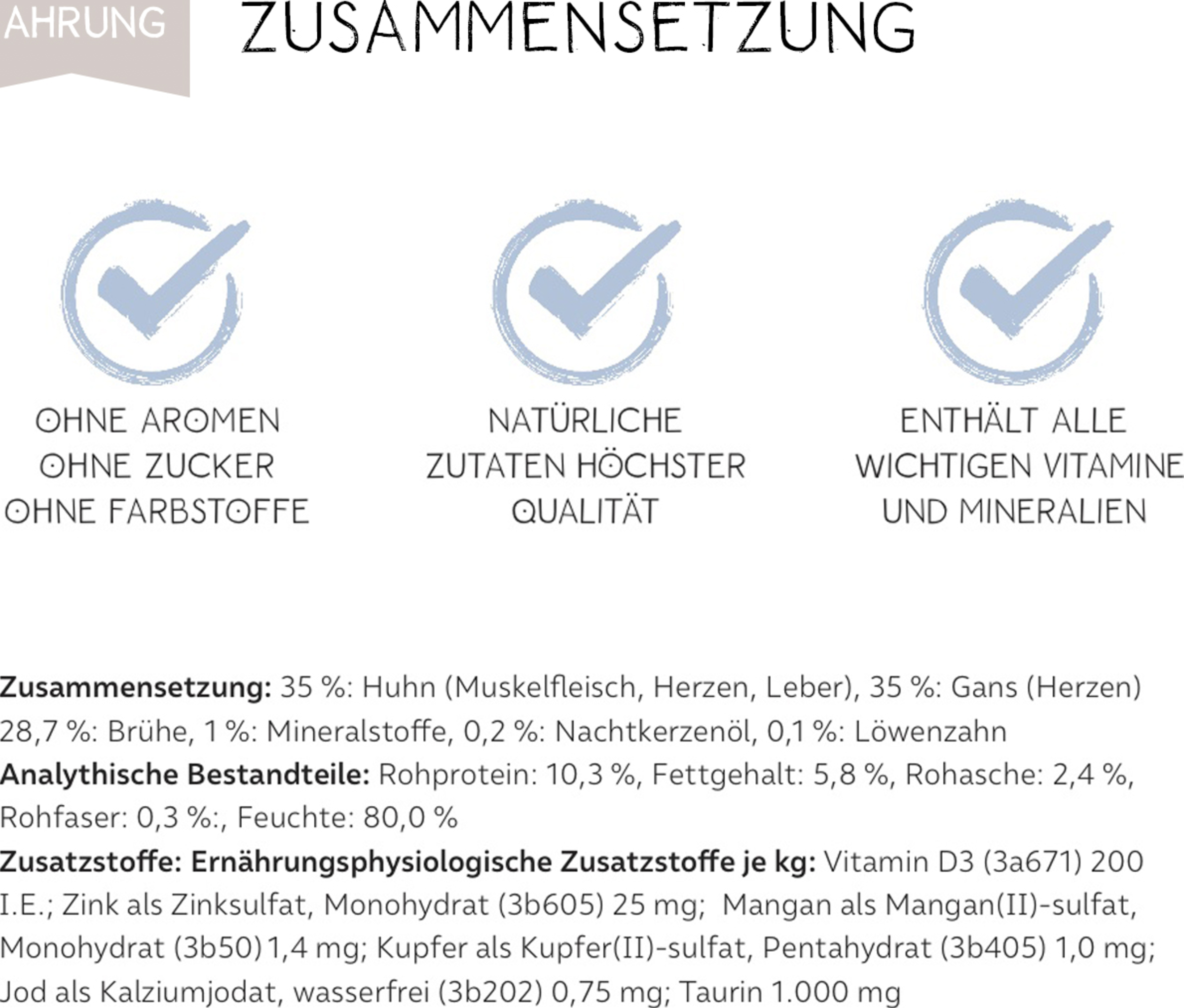 35% Huhn (Muskelfleisch, Herzen, Leber), 35% Gans (Herzen), 28,7% Trinkwasser, 1% Mineralstoffe, 0,2% Nachtkerzenöl, 0,1% Löwenzahn