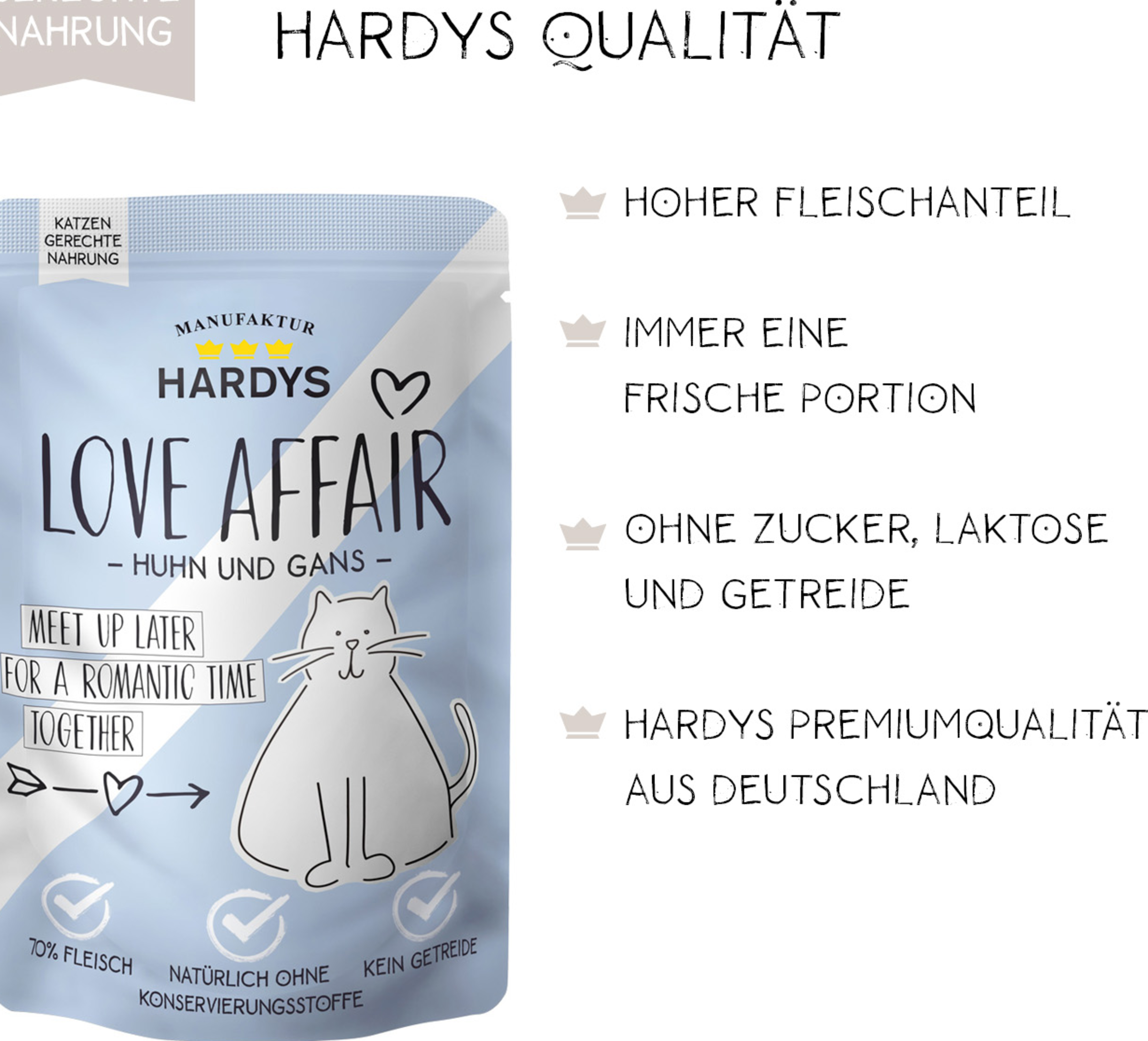 HARDYS LoveAffair Spezialitäten werden sorgfältig hergestellt und zwar ausschließlich in Deutschland. Dabei verwenden wir bei HARDYS am liebsten heimische Zutaten die vitaminschonend gegart werden. Zartes hochwertiges Fleisch, wertvolle Innereien und die feine Portion Nachtkerzenöl versorgen Ihre Katze mit allen wichtigen Nährstoffen und Omega Fettsäuren. Frei von Getreide, Zucker, künstlichen Aromen und Konservierungsstoffen.