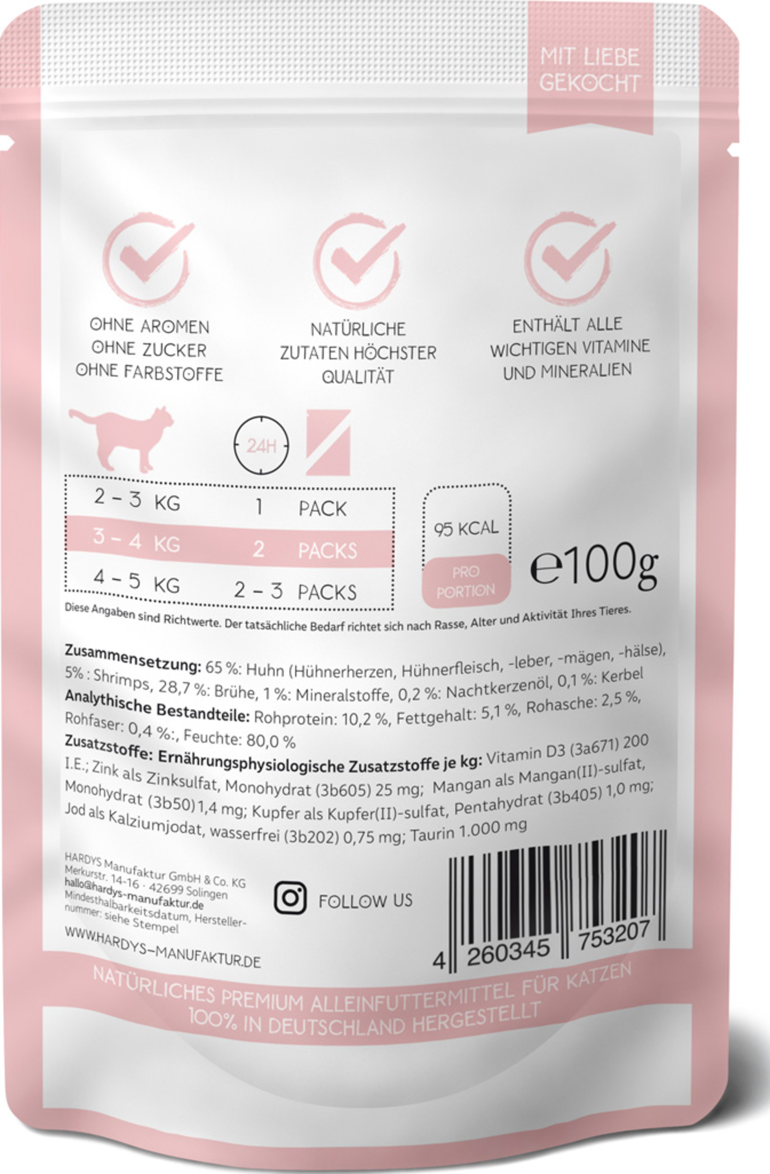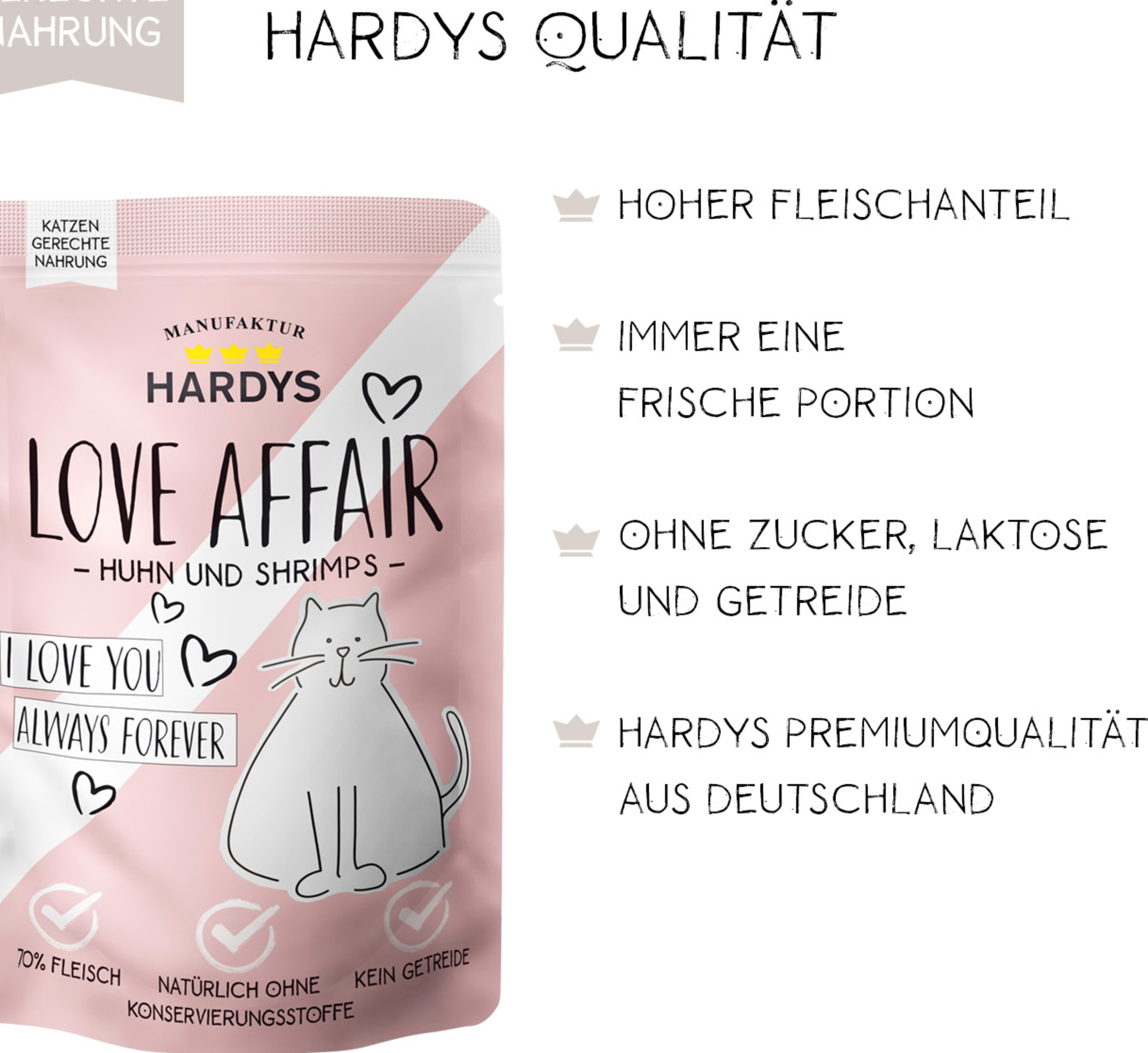 HARDYS LoveAffair Spezialitäten werden sorgfältig hergestellt und zwar ausschließlich in Deutschland. Dabei verwenden wir bei HARDYS am liebsten heimische Zutaten die vitaminschonend gegart werden. Zartes hochwertiges Fleisch, wertvolle Innereien und die feine Portion Nachtkerzenöl versorgen Ihre Katze mit allen wichtigen Nährstoffen und Omega Fettsäuren. Frei von Getreide, Zucker, künstlichen Aromen und Konservierungsstoffen.