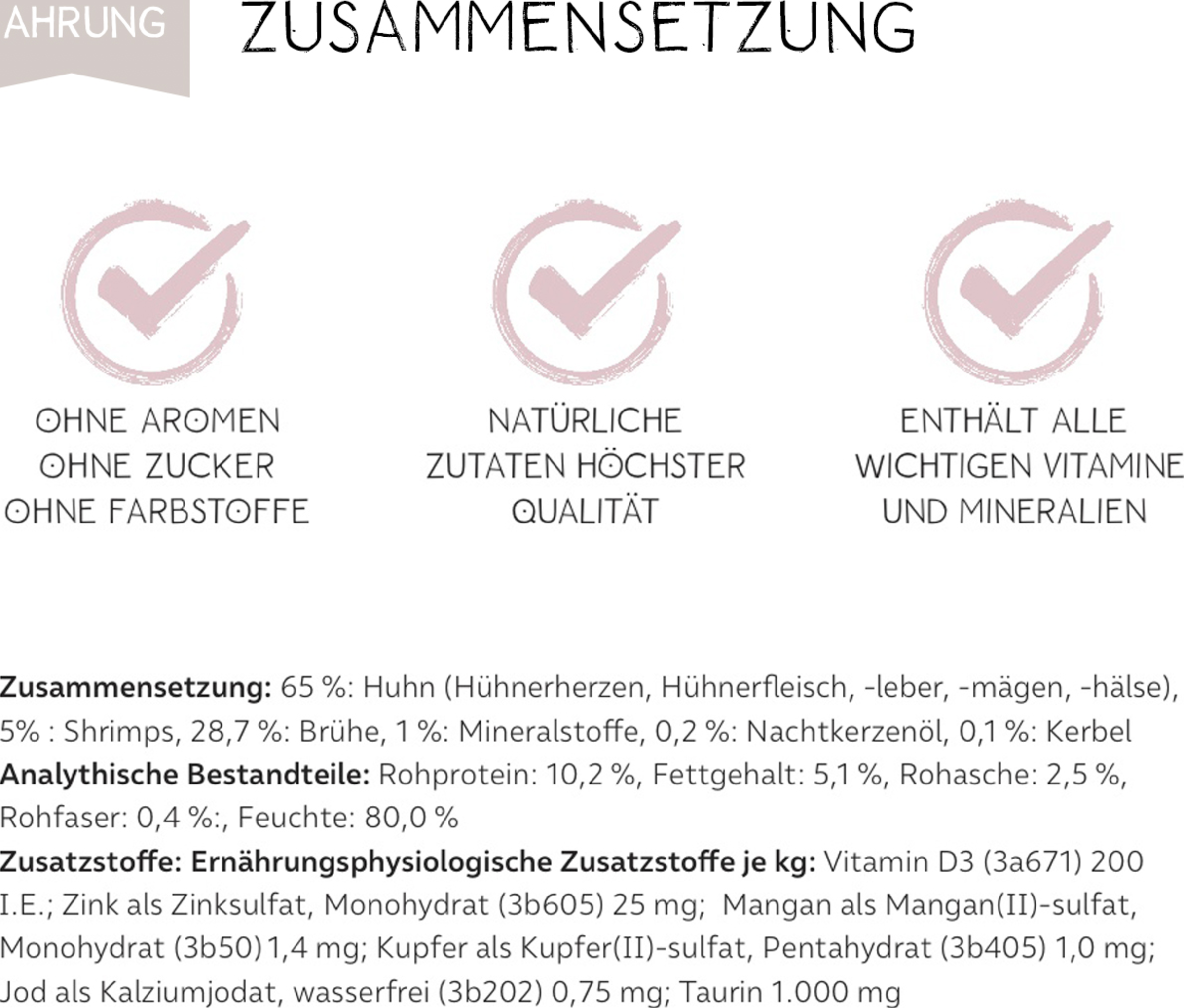 65% Huhn (Hühnerherzen, Hühnerfleisch, -leber, -mägen, -hälse), 5% Shrimps, 28,7% Brühe, 1% Mineralstoffe, 0,2% Nachtkerzenöl, 0,1% Kerbel