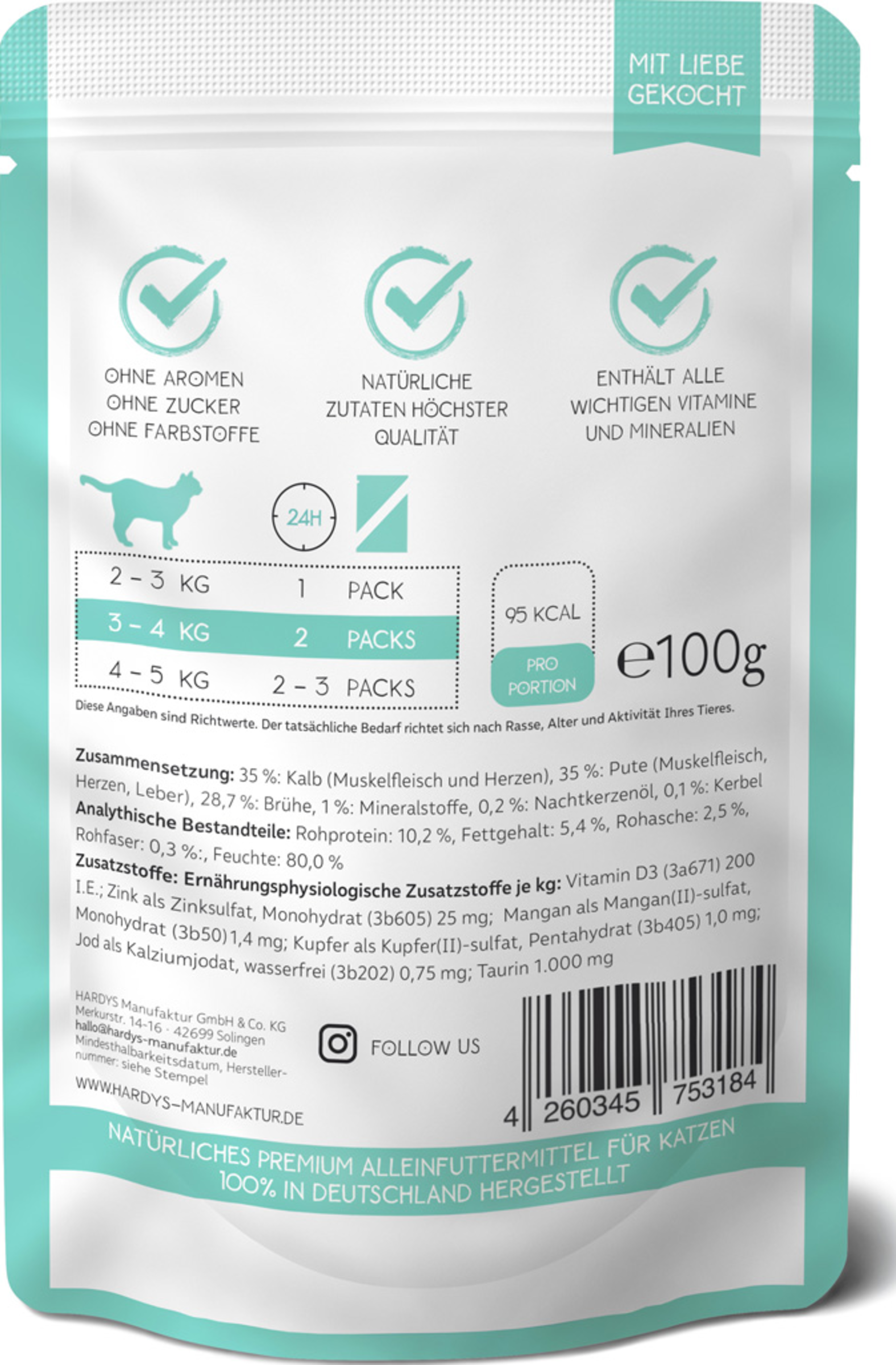 HARDYS LoveAffair Spezialitäten werden sorgfältig hergestellt und zwar ausschließlich in Deutschland. Dabei verwenden wir bei HARDYS am liebsten heimische Zutaten die vitaminschonend gegart werden. Zartes hochwertiges Fleisch, wertvolle Innereien und die feine Portion Nachtkerzenöl versorgen Ihre Katze mit allen wichtigen Nährstoffen und Omega Fettsäuren. Frei von Getreide, Zucker, künstlichen Aromen und Konservierungsstoffen.