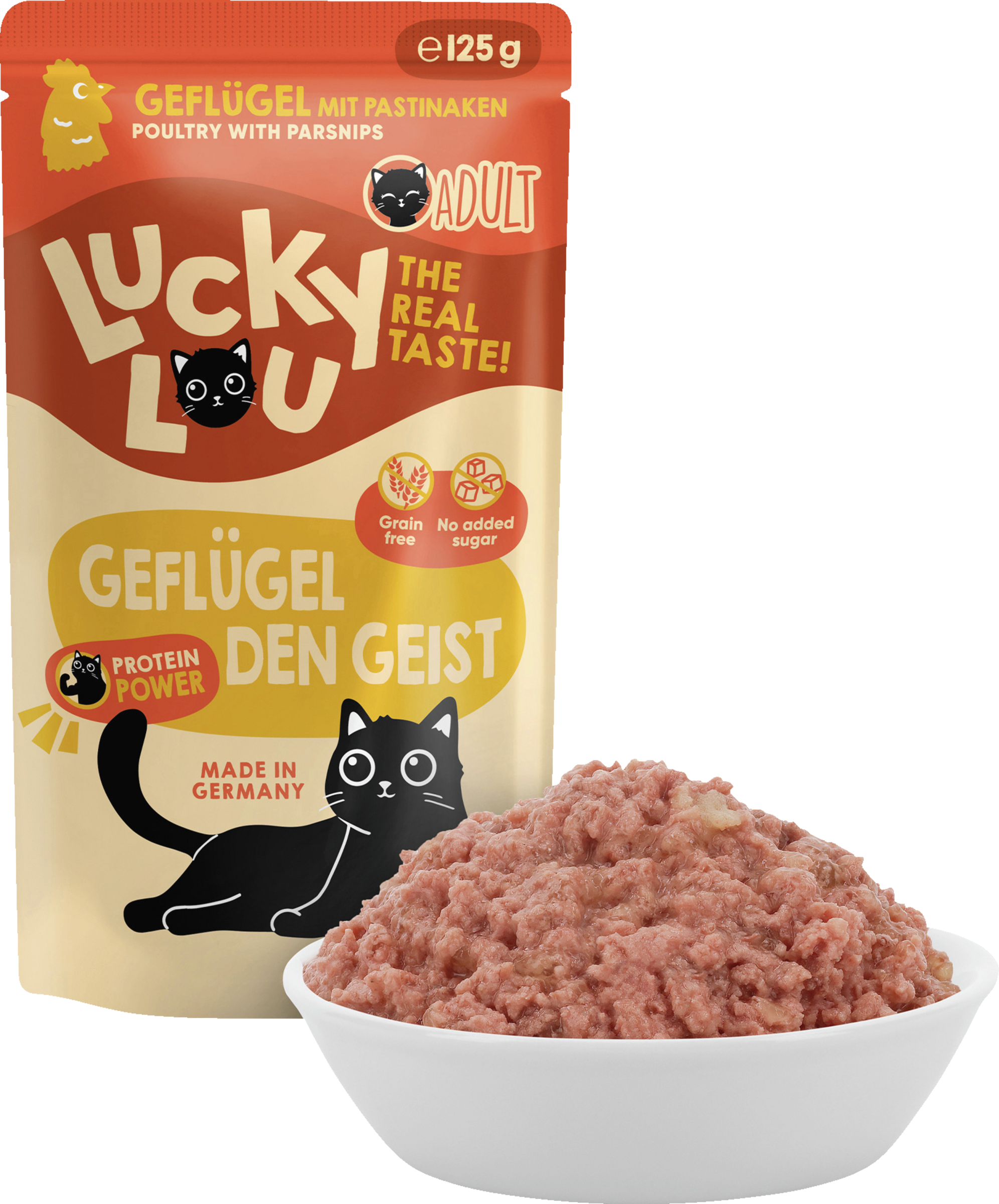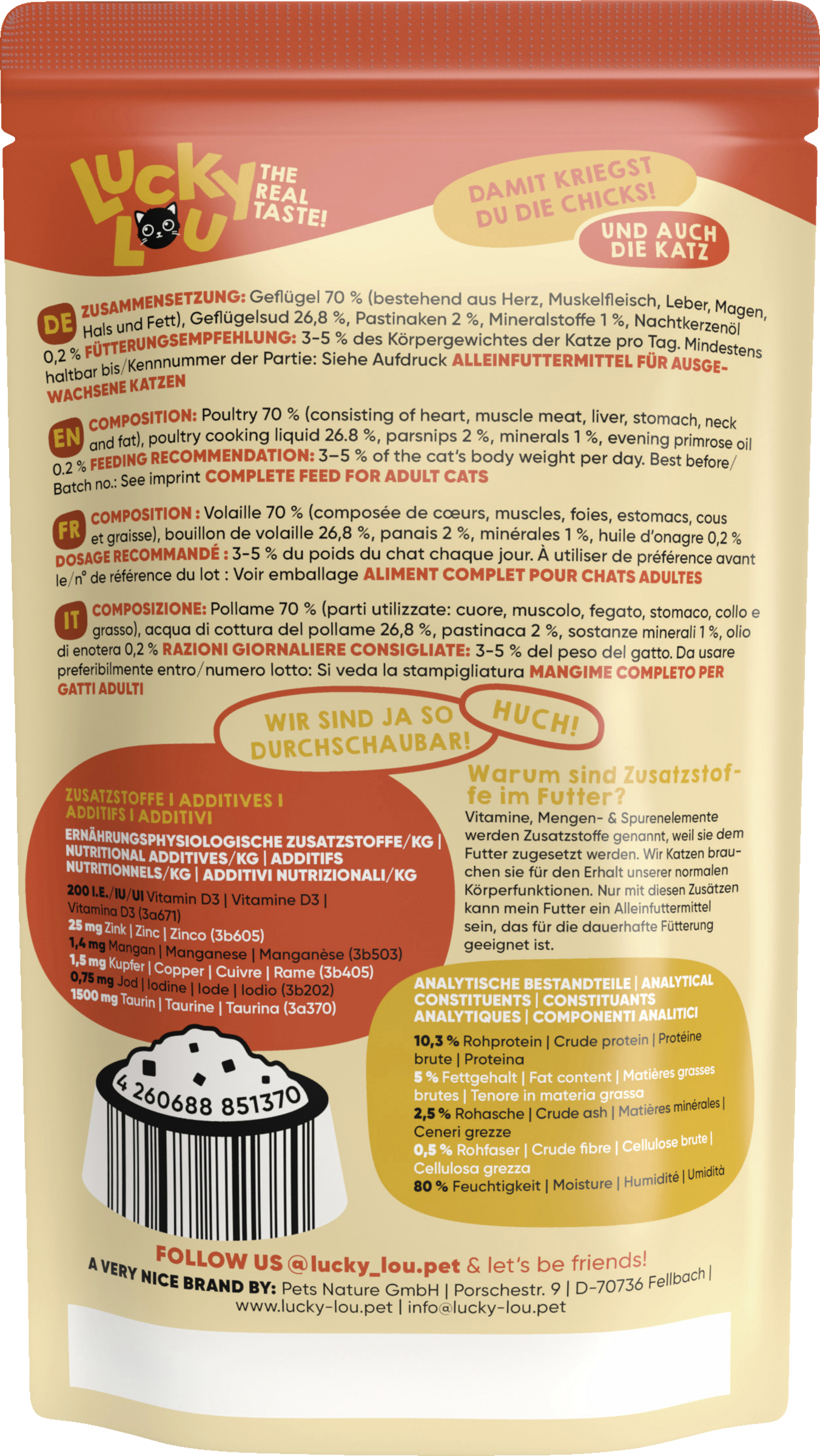 Lucky Lou Katzennahrung besteht aus mehr als 94 % Fleisch bzw. Fisch, Innereien und Kochsud und rund 2 % pflanzlichen Kohlenhydraten, 1 % Mineralstoffen und einem geringen Anteil eines hochwertigen Öls. Und weil das schlau gemacht ist, sind im Futter auch kein Getreide, kein Gluten und keine Zuckerzusätze enthalten. Echter Geschmack!
