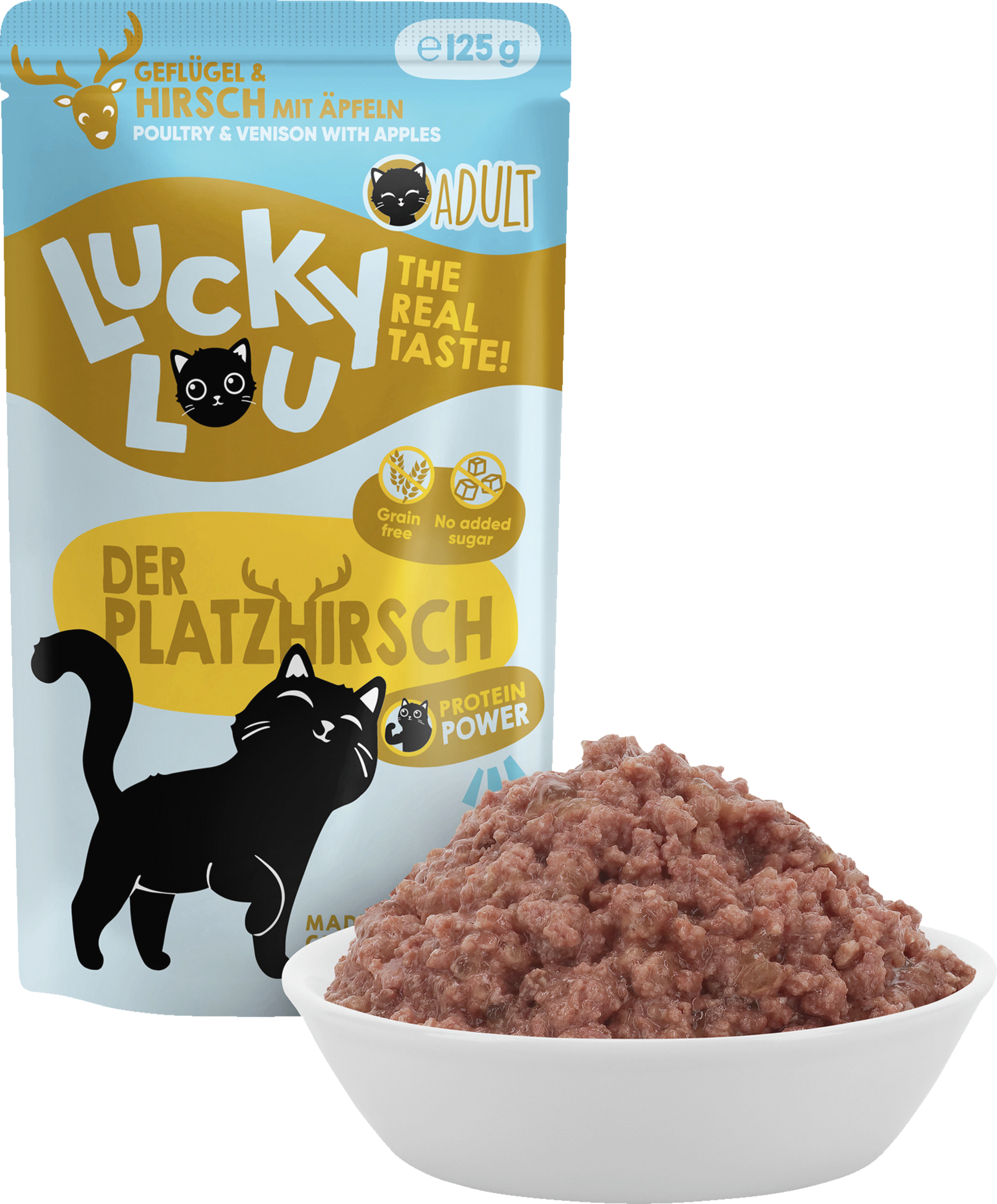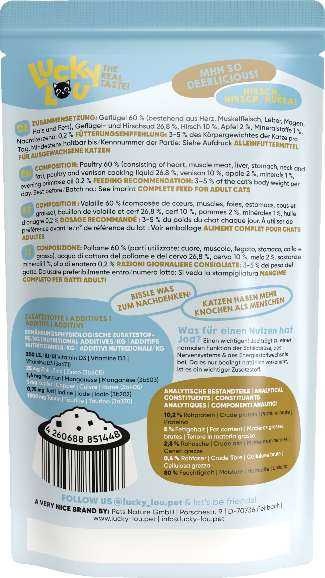 Lucky Lou Katzennahrung besteht aus mehr als 94 % Fleisch bzw. Fisch, Innereien und Kochsud und rund 2 % pflanzlichen Kohlenhydraten, 1 % Mineralstoffen und einem geringen Anteil eines hochwertigen Öls. Und weil das schlau gemacht ist, sind im Futter auch kein Getreide, kein Gluten und keine Zuckerzusätze enthalten. Echter Geschmack!