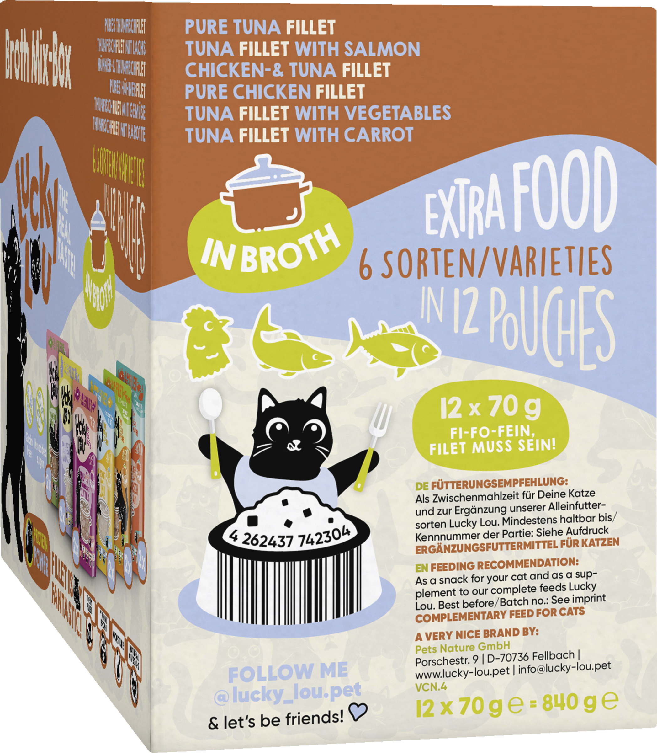 Lerne die köstliche Welt von Lucky Lou® mit unserem Extra Food Broth-Mix-Box kennen! Diese praktische Box enthält 12 Pouches à 70g, gefüllt mit leckerem Ergänzungsfutter für Katzen. Jede Sorte wurde sorgfältig entwickelt, um den feinen Gaumen deiner Katze zu verwöhnen und ihr eine extra Portion Geschmack zu bieten. Die verschiedenen Sorten in der Lucky Lou® Broth-Mix-Box sind nicht nur schmackhaft, sondern auch nahrhaft und ideal, um die Ernährung deiner Katze zu bereichern. Verwöhne deine feline Freundin mit diesem leckeren und gesunden Futter, das sie lieben wird!