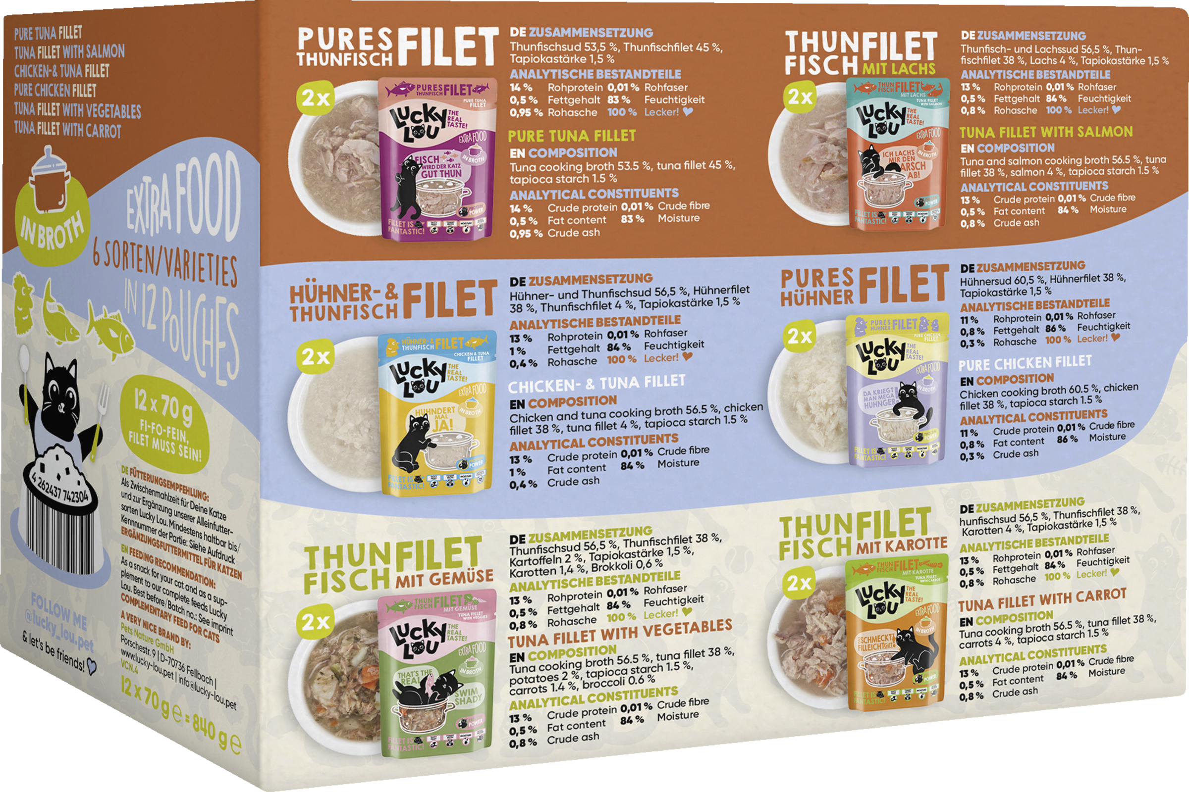 62980 Lucky Lou EF Thf. Gemüse in Broth 70g PB: Rohprotein 13 %, Fettgehalt 0,5 %, Rohasche 0,8 %, Rohfaser 0,01 %, Feuchtigkeit 84 %