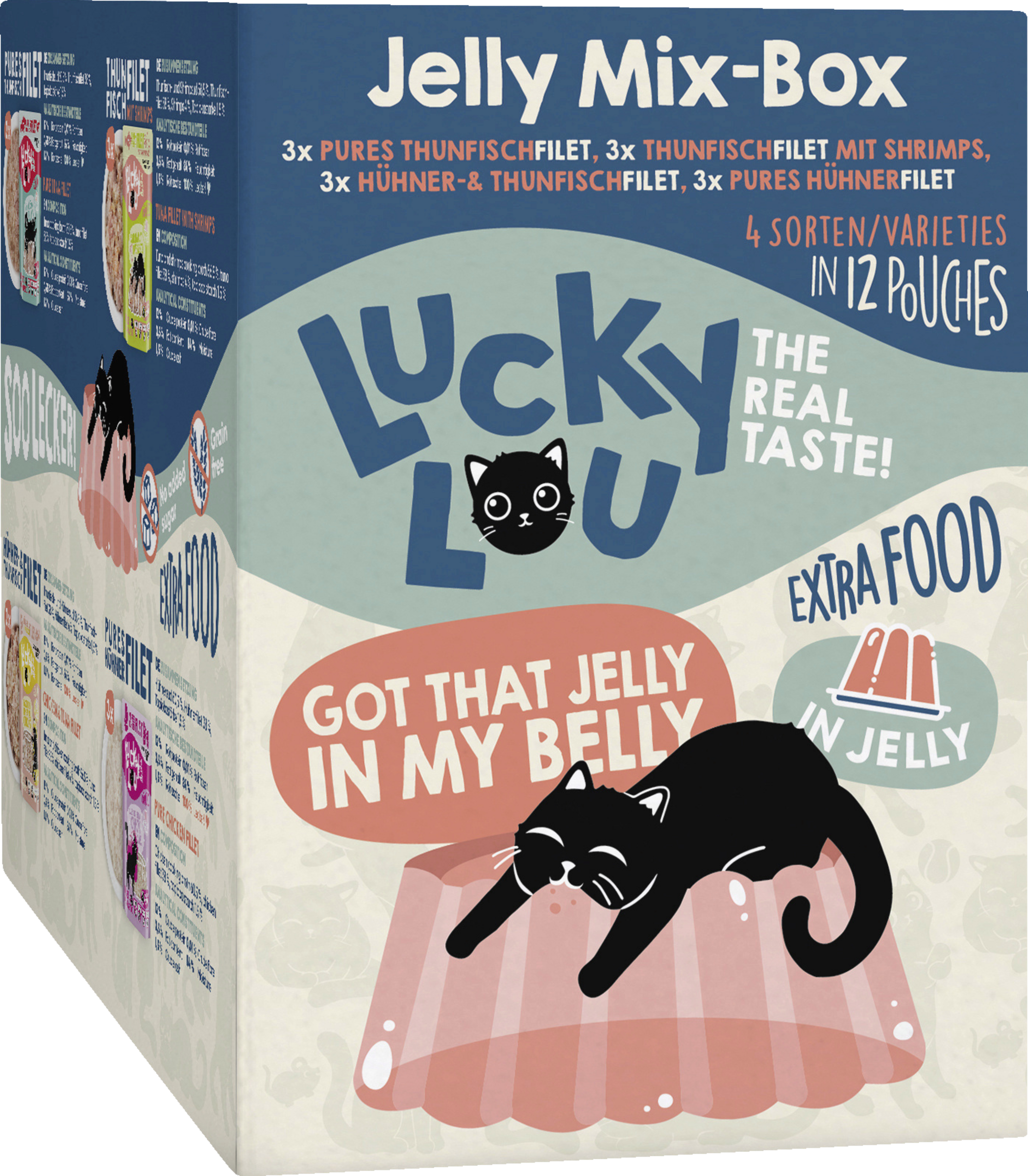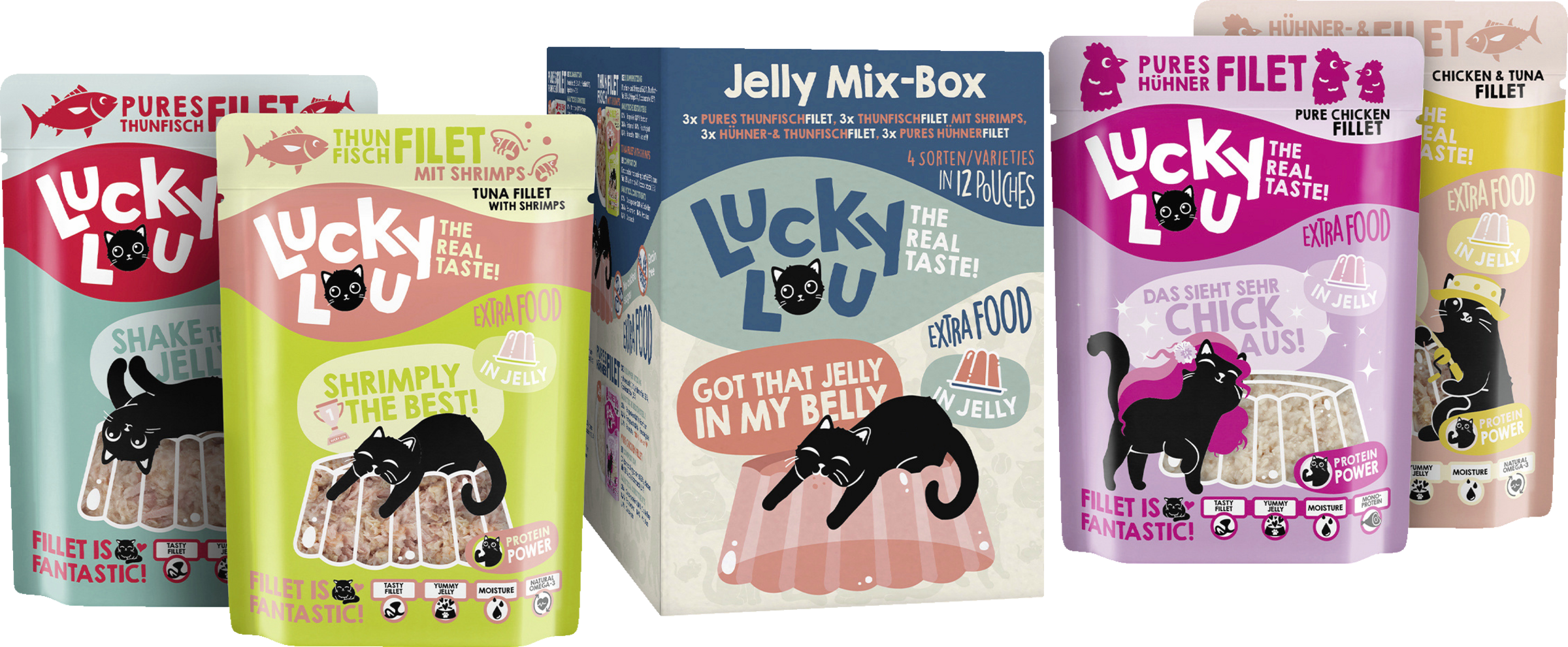 enthält je 3x: 62000 Lucky Lou EF Hühnerfilet in Jelly 70g PB 62997 Lucky Lou EF Th. & Hühnerf. In Jelly 70g PB 62959 Lucky Lou EF THf. & Shrim. In Jelly 70g PB 62942 Lucky Lou EF Thunfischf. In Jelly 70g PB