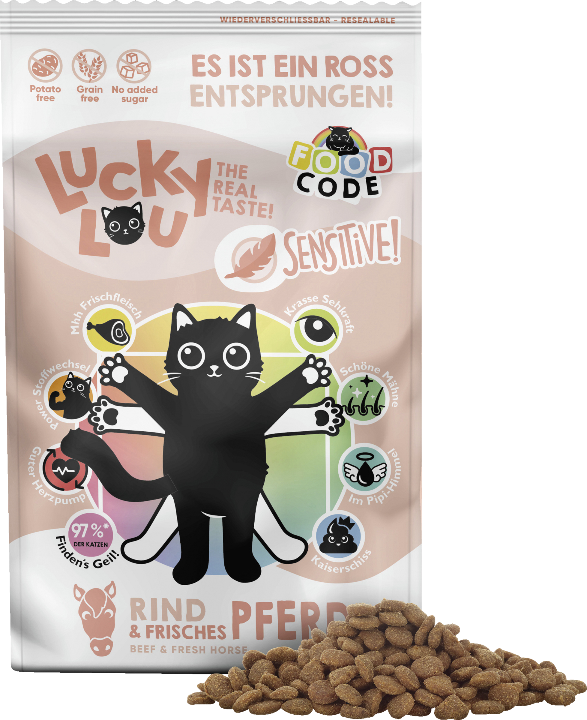 Das Trockenfutter von Lucky Lou® Food Code Sensitive für adulte Katzen vereint die besten Zutaten, um deiner Katze ein glückliches und gesundes Leben zu ermöglichen. Mit einer köstlichen Kombination aus Rind und Pferd bietet dieses Futter nicht nur einen unvergleichlichen Geschmack, sondern ist auch speziell auf die Bedürfnisse von sensiblen Katzen abgestimmt. Lucky Lou® steht für Qualität und Vertrauen – damit du dir sicher sein kannst, dass du deiner Katze nur das Beste bietest. Verwöhne deine Katze mit Lucky Lou® Food Code Sensitive Adult Rind & Pferd und erlebe, wie sie mit jedem Bissen glücklicher wird!