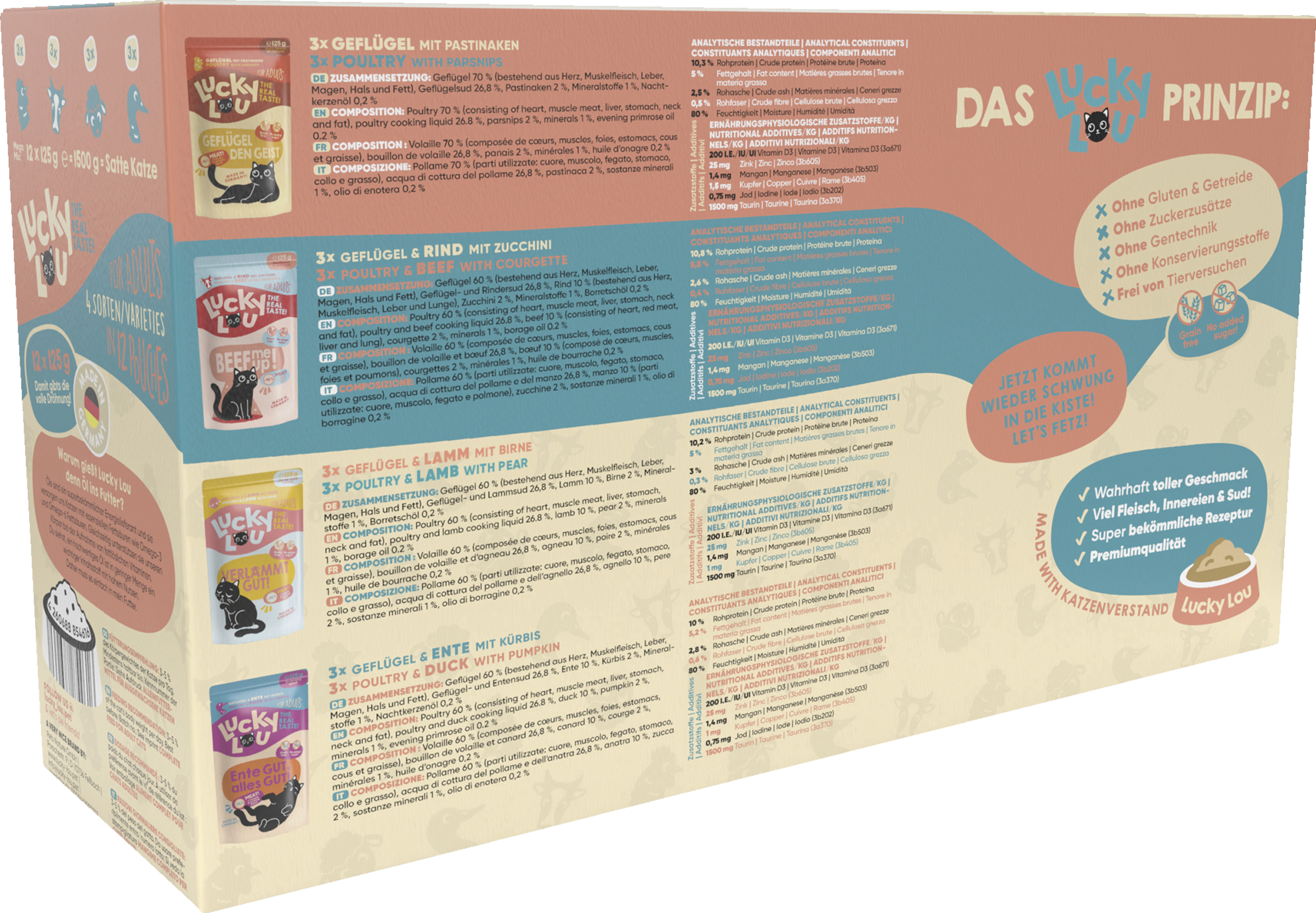 014417 Lucky Lou Lifestage Adult Geflügel & Ente 125g: Geflügel 60 % (bestehend aus Herz, Muskel?eisch, Leber, Magen, Hals und Fett), Geflügel- und Entensud 26,8 %, Ente 10 %, Kürbis 2 %, Mineralstoffe 1 %, Nachtkerzenöl 0,2 %
