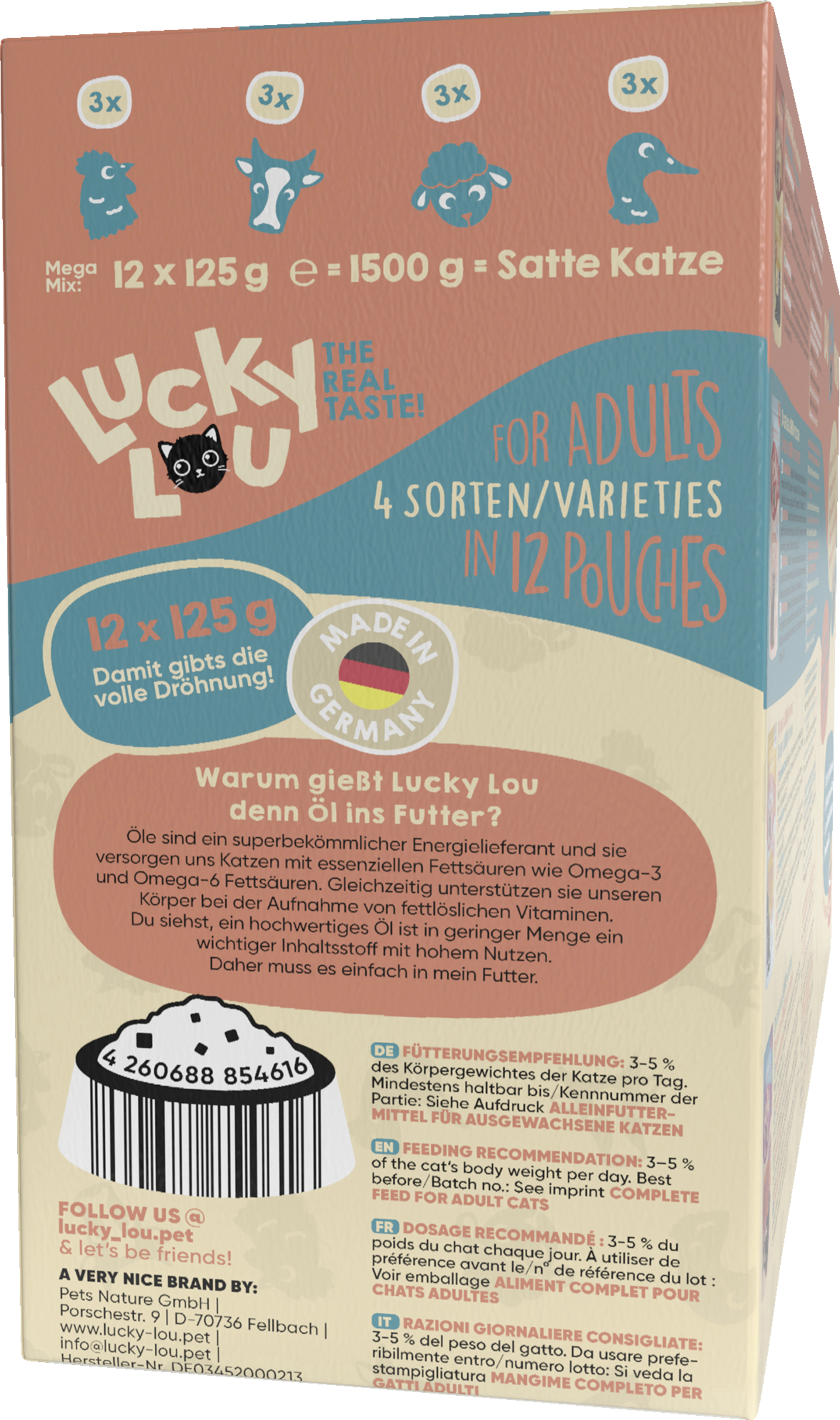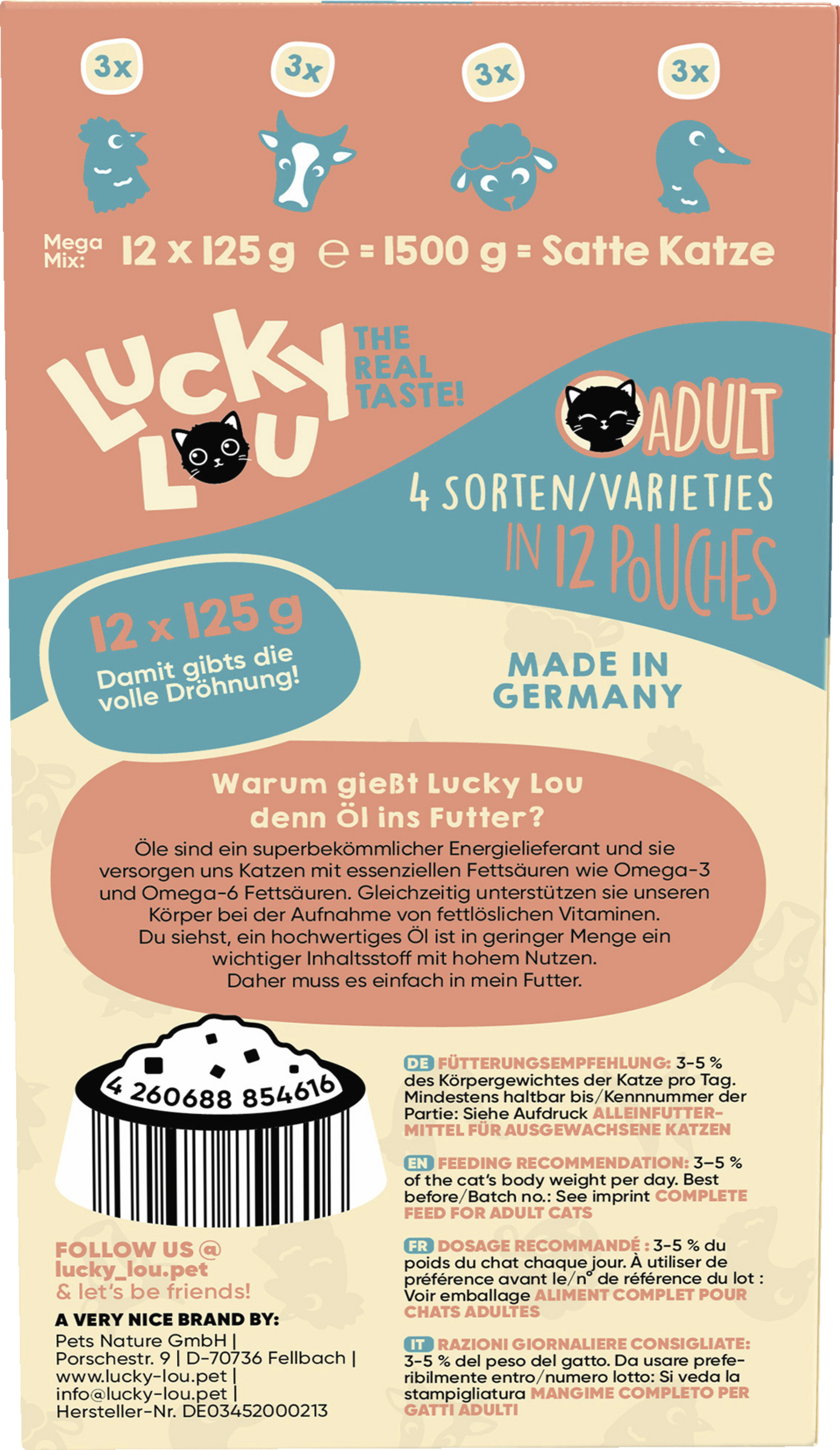 Der Lucky Lou® Lifestage Adult Tasty-Mix 12er-Pack 1,5kg – die perfekte Wahl für anspruchsvolle Katzenliebhaber! Dieses abwechslungsreiche Nassfutter bietet deiner Katze eine köstliche Mischung aus verschiedenen Sorten, die speziell für die Bedürfnisse erwachsener Katzen entwickelt wurden. Mit insgesamt 12 Portionen in einem praktischen Pack erhältst du eine Vielzahl an Geschmacksrichtungen, die für Abwechslung im Futterteller sorgen. Jede Sorte ist sorgfältig ausgewählt, um deiner Katze nicht nur einen unvergleichlichen Geschmack zu bieten, sondern auch die Nährstoffe, die sie für ein gesundes und glückliches Leben benötigt. Verwöhne deine Katze mit dem Lucky Lou® Lifestage Adult Tasty-Mix und bringe Freude in ihre Mahlzeiten! Ideal für alle, die ihren pelzigen Freunden das Beste bieten möchten.