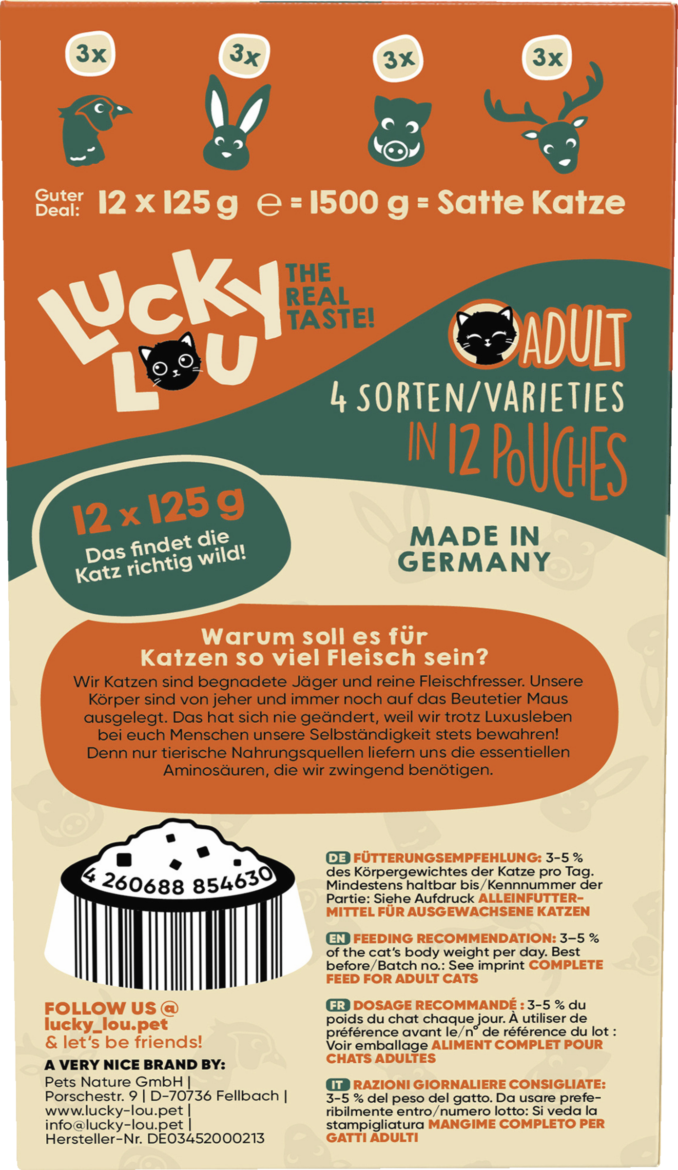Entdecke unseren Lucky Lou® Lifestage Adult Wild-Mix 12er-Pack 1,5kg – die perfekte Wahl für anspruchsvolle Haustierbesitzer, die ihrem vierbeinigen Freunden eine abwechslungsreiche und gesunde Ernährung bieten möchten. Dieser Multipack enthält verschiedene Sorten, die speziell für erwachsene Tiere entwickelt wurden und eine ausgewogene Mischung aus hochwertigen Zutaten bieten. Mit dem Lucky Lou® Lifestage Adult Wild-Mix kannst du dir sicher sein, dass dein Haustier die Nährstoffe erhält, die es für ein glückliches und aktives Leben benötigt. Jede Sorte ist sorgfältig zusammengestellt, um den natürlichen Instinkten deines Tieres gerecht zu werden und gleichzeitig für Abwechslung im Futterteller zu sorgen. Das 12er-Pack mit insgesamt 1,5 kg ist ideal für alle, die Wert auf Qualität und Vielfalt legen. Verwöhne deinen Liebling mit dem Lucky Lou® Lifestage Adult Wild-Mix und erlebe, wie viel Freude eine gesunde Ernährung bringen kann!