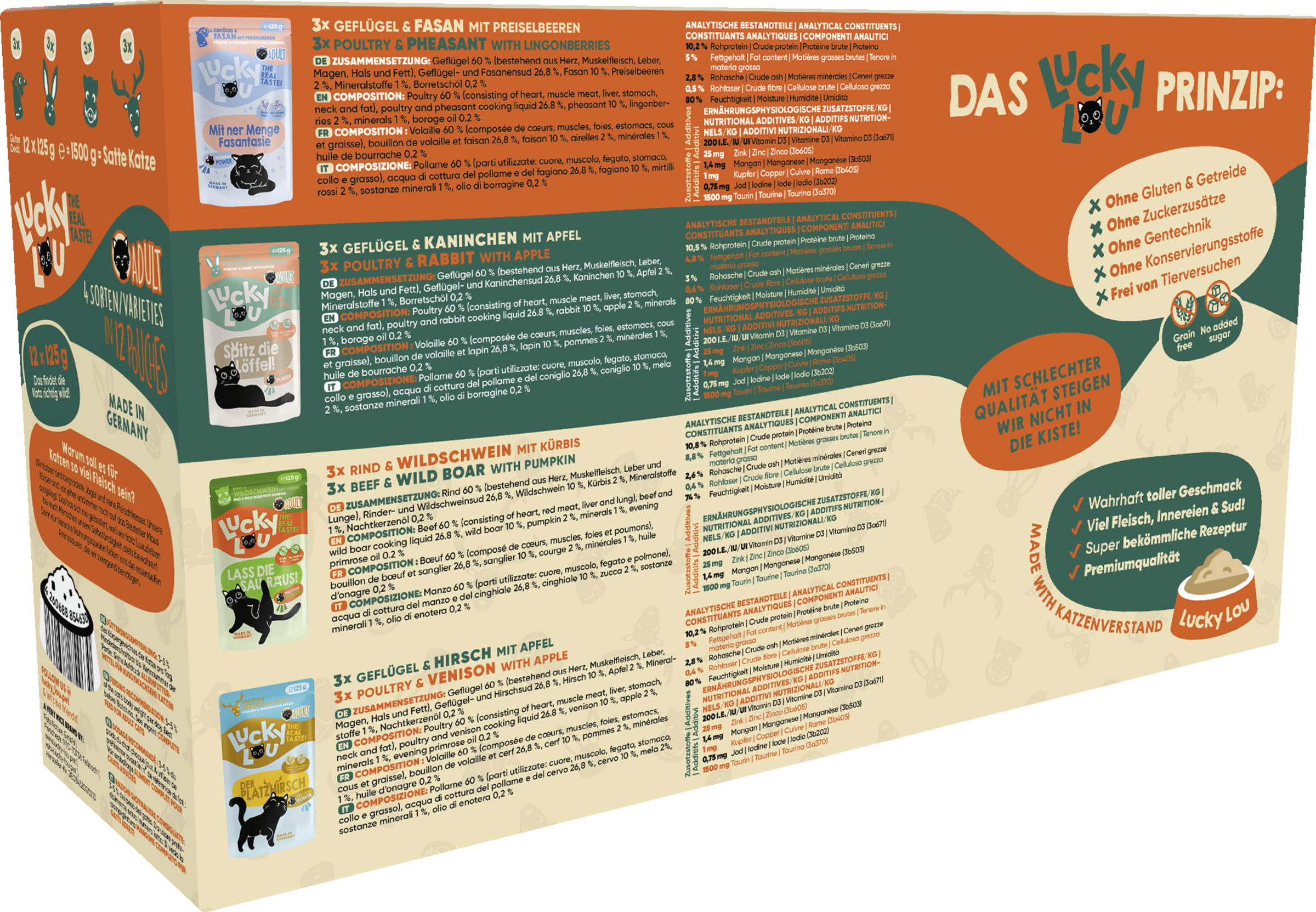 014448 Lucky Lou Lifestage Adult Geflügel & Hirsch 125g: Geflügel 60 % (bestehend aus Herz, Muskelfeisch, Leber, Magen, Hals und Fett), Geflügel- und Hirschsud 26,8 %, Hirsch 10 %, Apfel 2 %, Mineralstoffe 1 %, Nachtkerzenöl 0,2 %