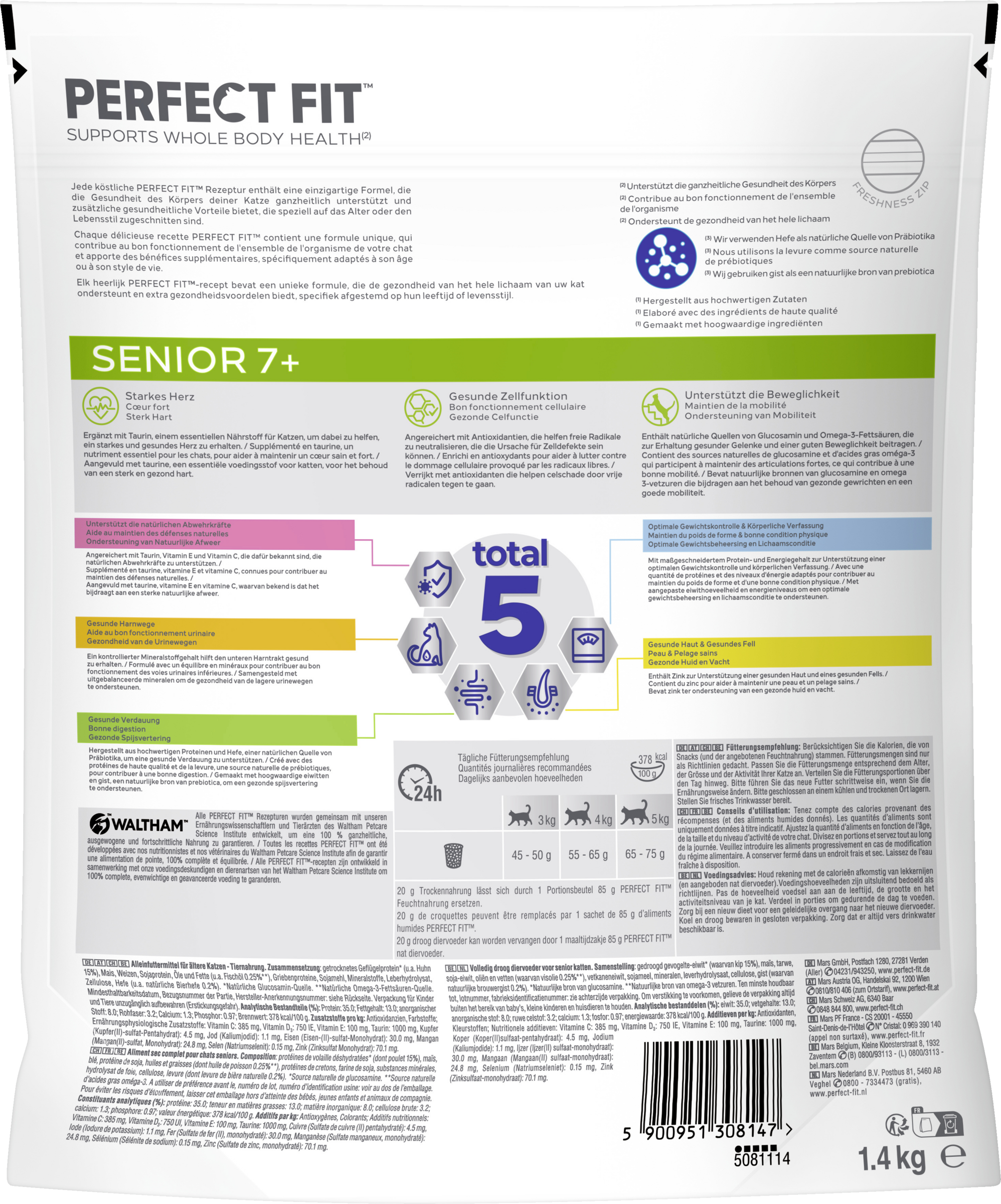 - die PERFECT FIT™ Total-5-Formel bietet fünffachen Rundumschutz: gesunde Verdauung, unterstützt die natürlichen Abwehrkräfte, gesunde Harnwege, optimale Gewichtskontrolle & körperliche Verfassung, gesunde Haut & gesundes Fell